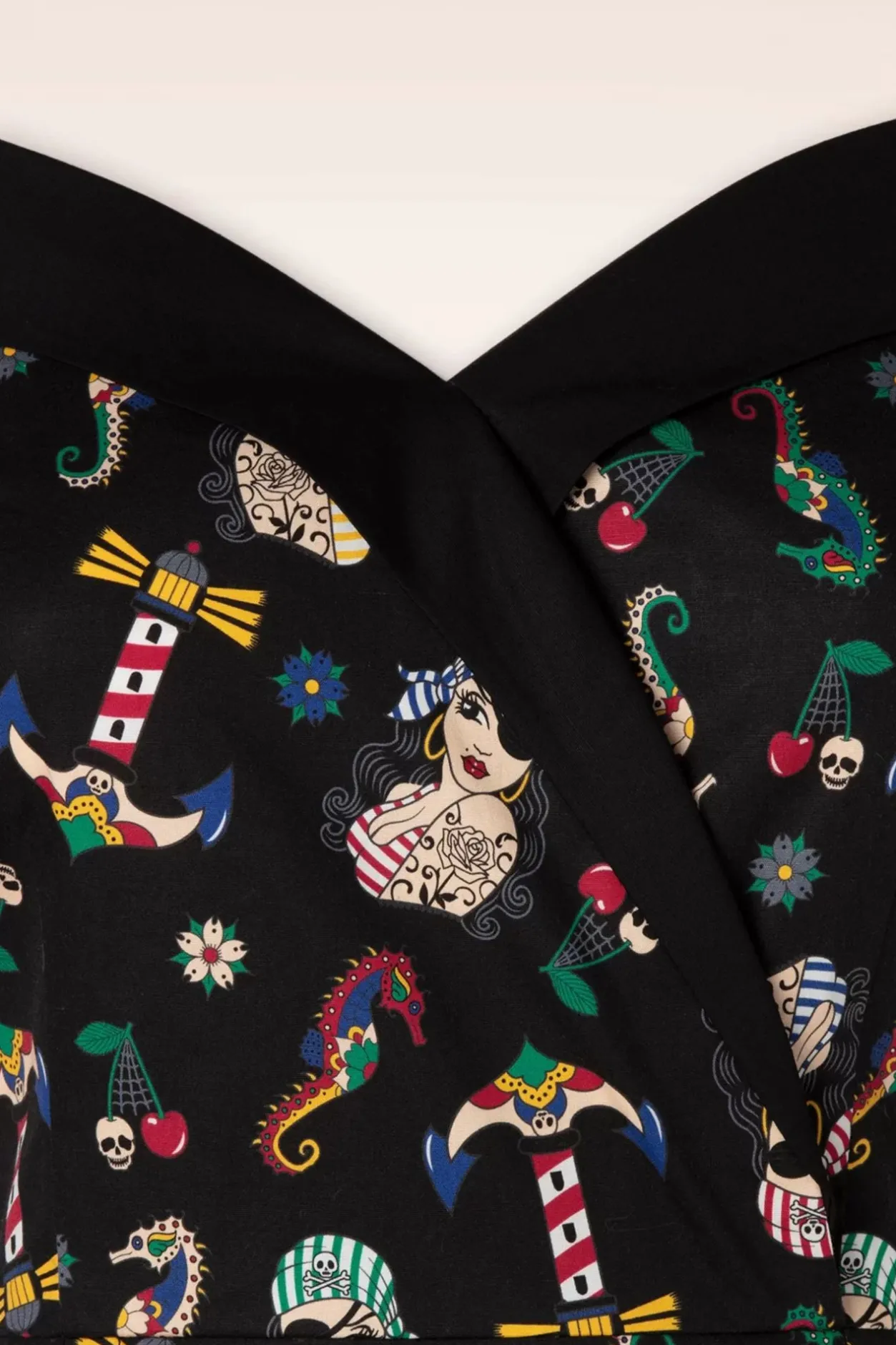 “Ahoy, Me Hearties!” Deze Anchor Pin Up Pencil Dress In Black Is Zo Cute! Ze Heeft Een Flatterende V-Halslijn, Een Kleurrijke Sailor Print En Omarmt Je Rondingen Perfect Zonder Af Te Tekenen. Uitgevoerd In Een Luchtige, Zwarte Katoenmix Met Een Lichte Stretch Die Heerlijk Draagt. “Yo Ho Ho And A Bottle Of Fashion!” 😉