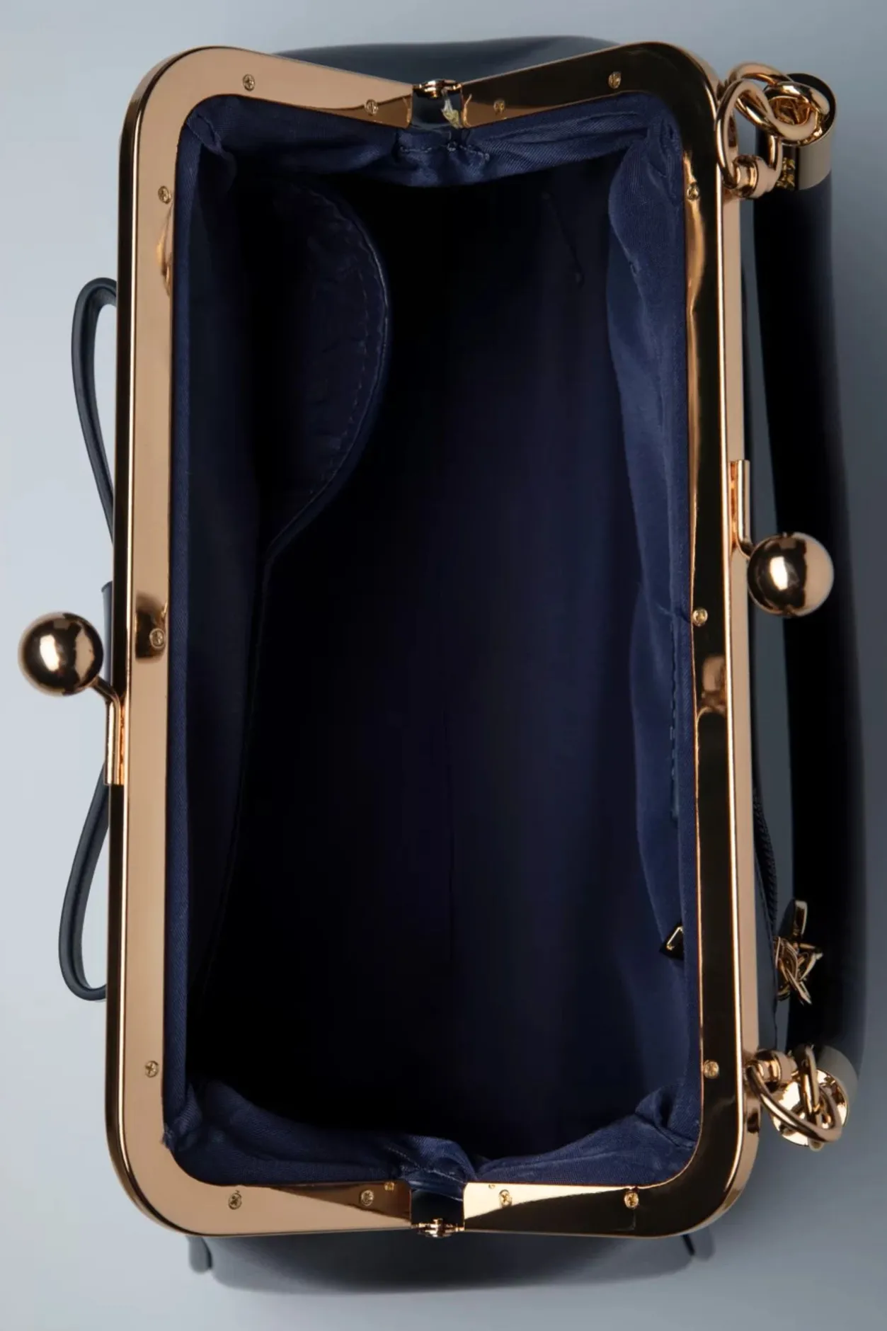 ”Just A Daydream Away!” Dit Kleine Zusje Van De Klassieke American Vintage Bag Heeft Een Opvallende Goudkleurige Metalen Klipsluiting Voor Een Echte Vintage Look En Is Uitgevoerd In Navyblauw Mat Imitatie Leder Afgewerkt Met Een Schattige Strik.