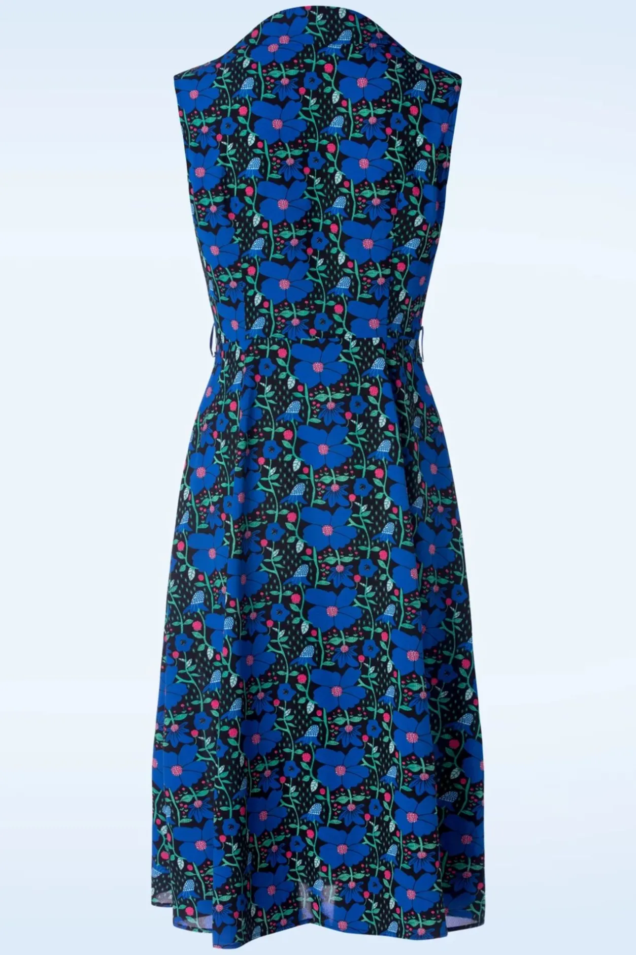 ”Flower Power… Every Minute, Every Hour!” Deze Mouwloze Doorknoopjurk Is Uitgevoerd In Een Luchtige, Soepele Zwarte Stof (Stretcht Niet!) Met Een Prachtige Print Van Vooral Blauwe Bloemen.