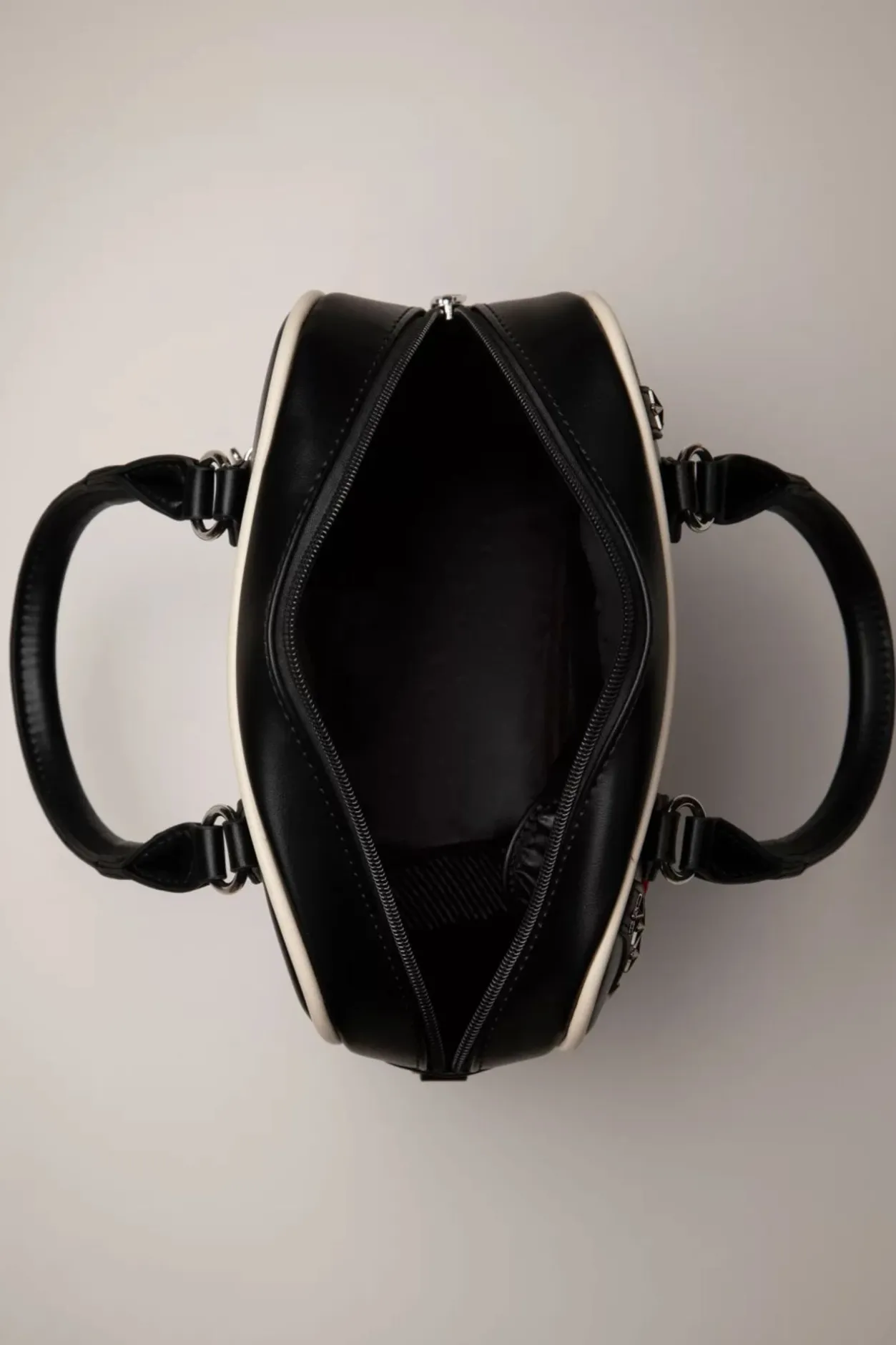 Deze Handtas Is Een Schot In De Roos! Uitgevoerd In Zwart Imitatie Leder Afgewerkt Met Crèmekleurige Biesjes, Zilverkleurige Sterretjes En Een Geborduurde Print Van Dart Pijltjes Met De Tekst: ‘Keep ‘Em Flying’
