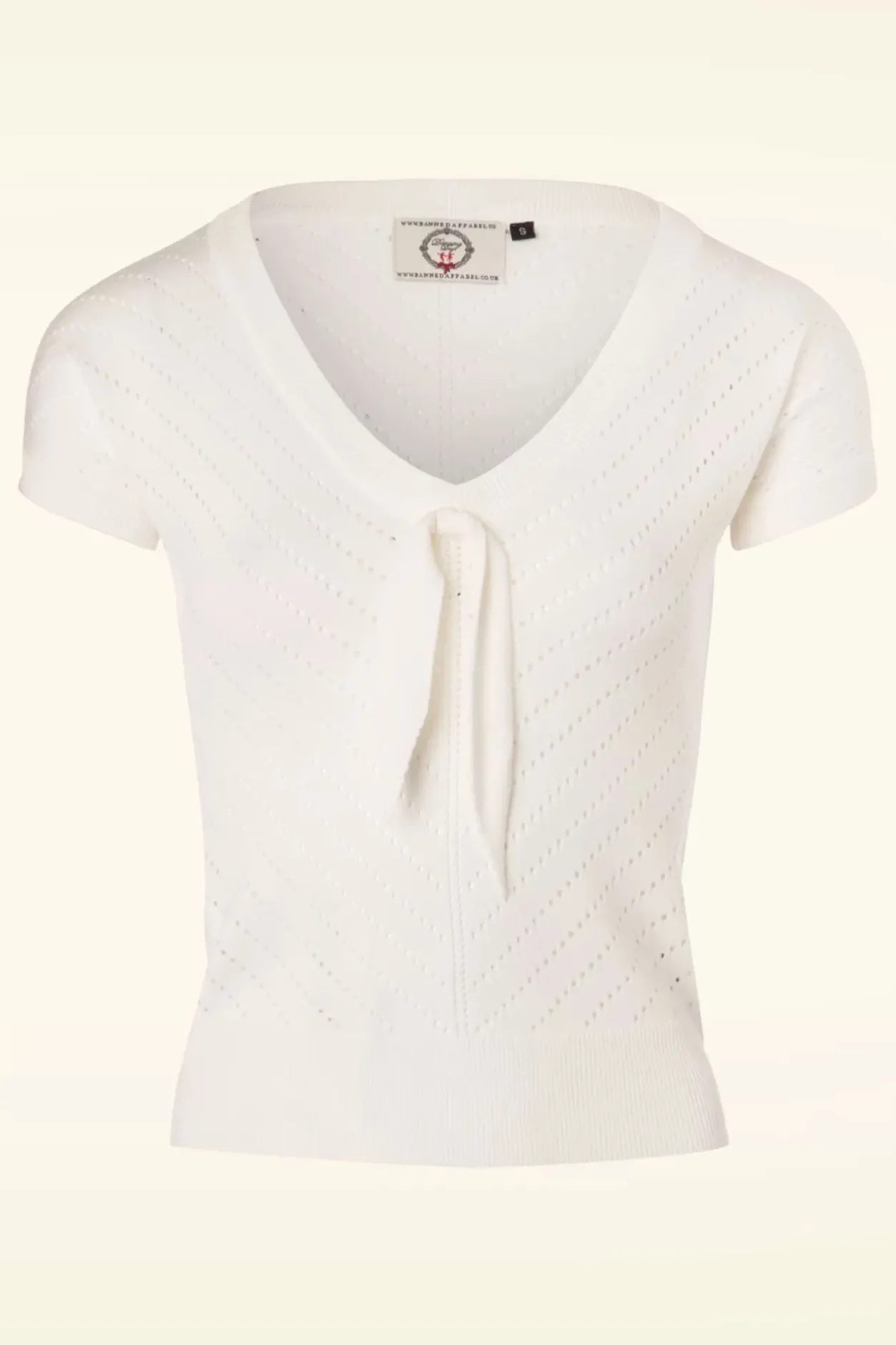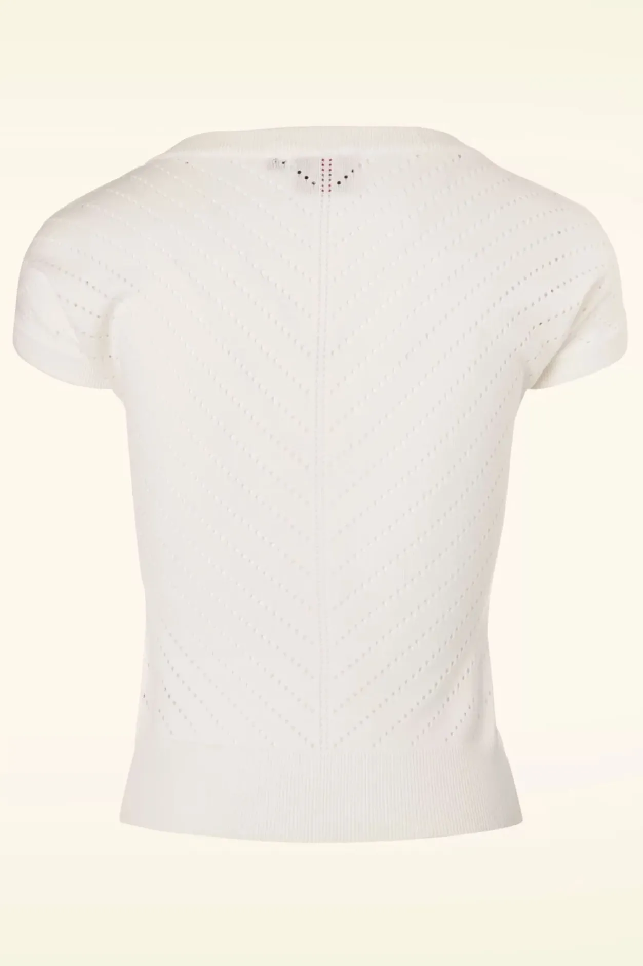 Deze 50S Patricia Pointelle Top In Off White Is Er Eentje Om Verliefd Op Te Worden! Nee, Dit Is Geen Illusie… Deze Prachtige Top Is Een Droom Die Uitkomt! De Top Heeft Een Mooie V-Halslijn Met Een Speelse Strik En Korte Mouwen, Cute! Uitgevoerd In Een Heerlijk Soepele, Stretchy, Fijngebreide, Ivoorwitte Viscosemix Met Een Klassiek Opengewerkt Patroon. Een Veelzijdige Top Die Niet Mag Ontbreken In De Kast Van Een Echte Vintage Lady!