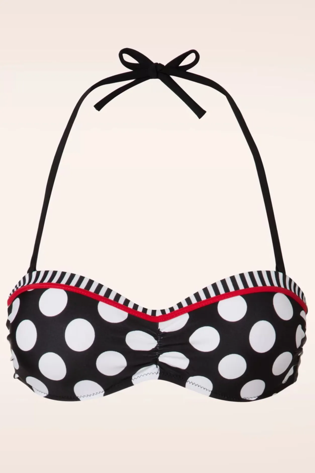Met Deze 50S Debra Polkadot Stripes Halter Bikini Top In Black And White Ben Jij Summerproof! Debra Heeft Een Halterstijl Bandje, Voorgevormde Push-Up Cups Waardoor Je Borsten Net Dat Beetje Extra Steun Krijgen En Een Speels Plooidetail Bij De Buste. Het Halterbandje Is Natuurlijk Heel Erg Handig Als Jij Een Frisse Duik Gaat Nemen Maar Wanneer Jij In Het Zonnetje Gaat Liggen Met Een Cocktail In Je Handen Kan Jij Het Bandje Er Gewoon Van Af Halen… We Only Love White Stripes On Our Bikini 😉 Uitgevoerd In Een Comfortabel, Stretchy Stofje Met Witte Polkadots En Streepjes Dat Heerlijk Draagt En Perfect Aansluit. Deze Showstopper Mag Absoluut Niet In Je Vintage Swimwear Collectie Ontbreken!
