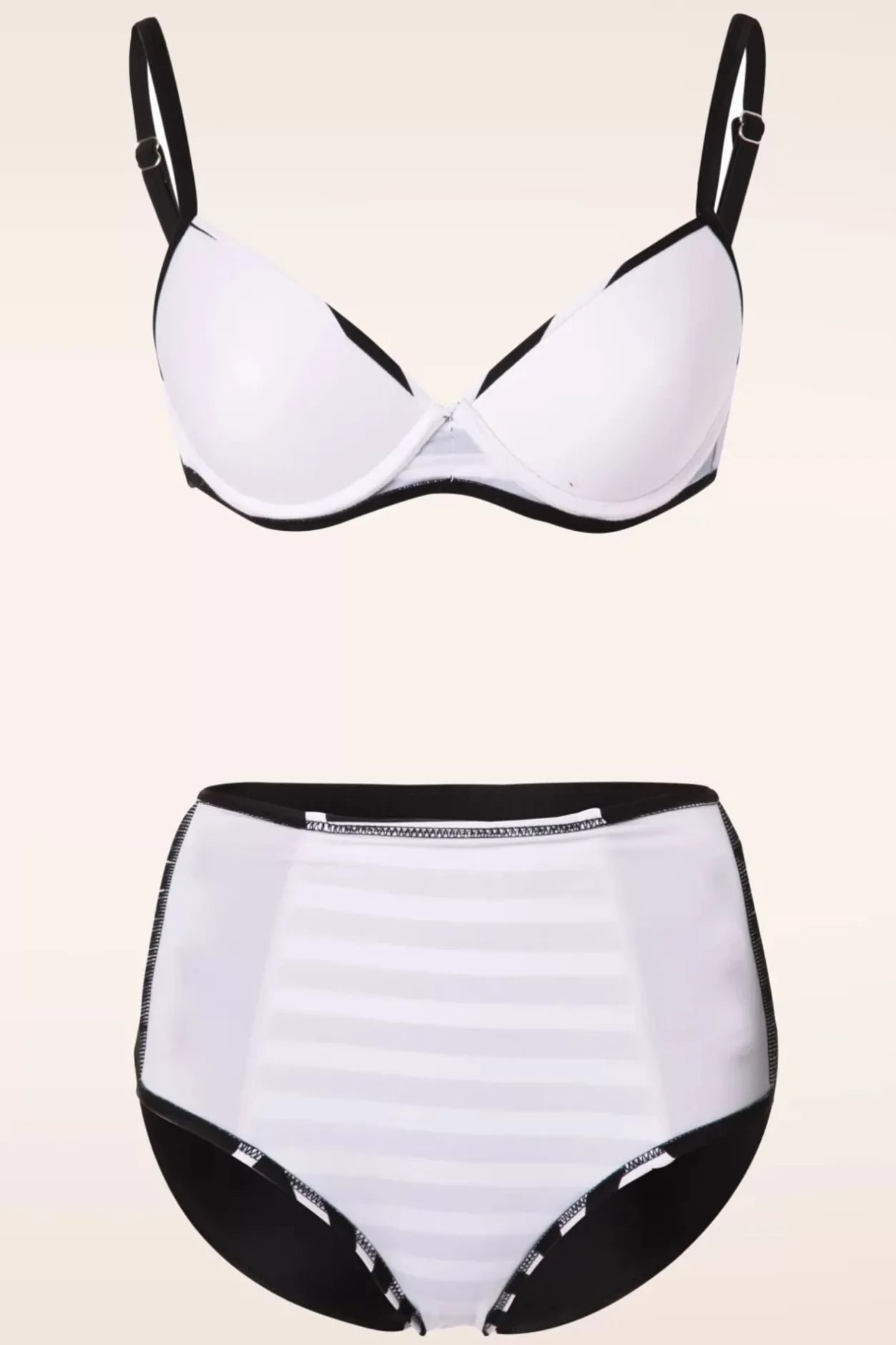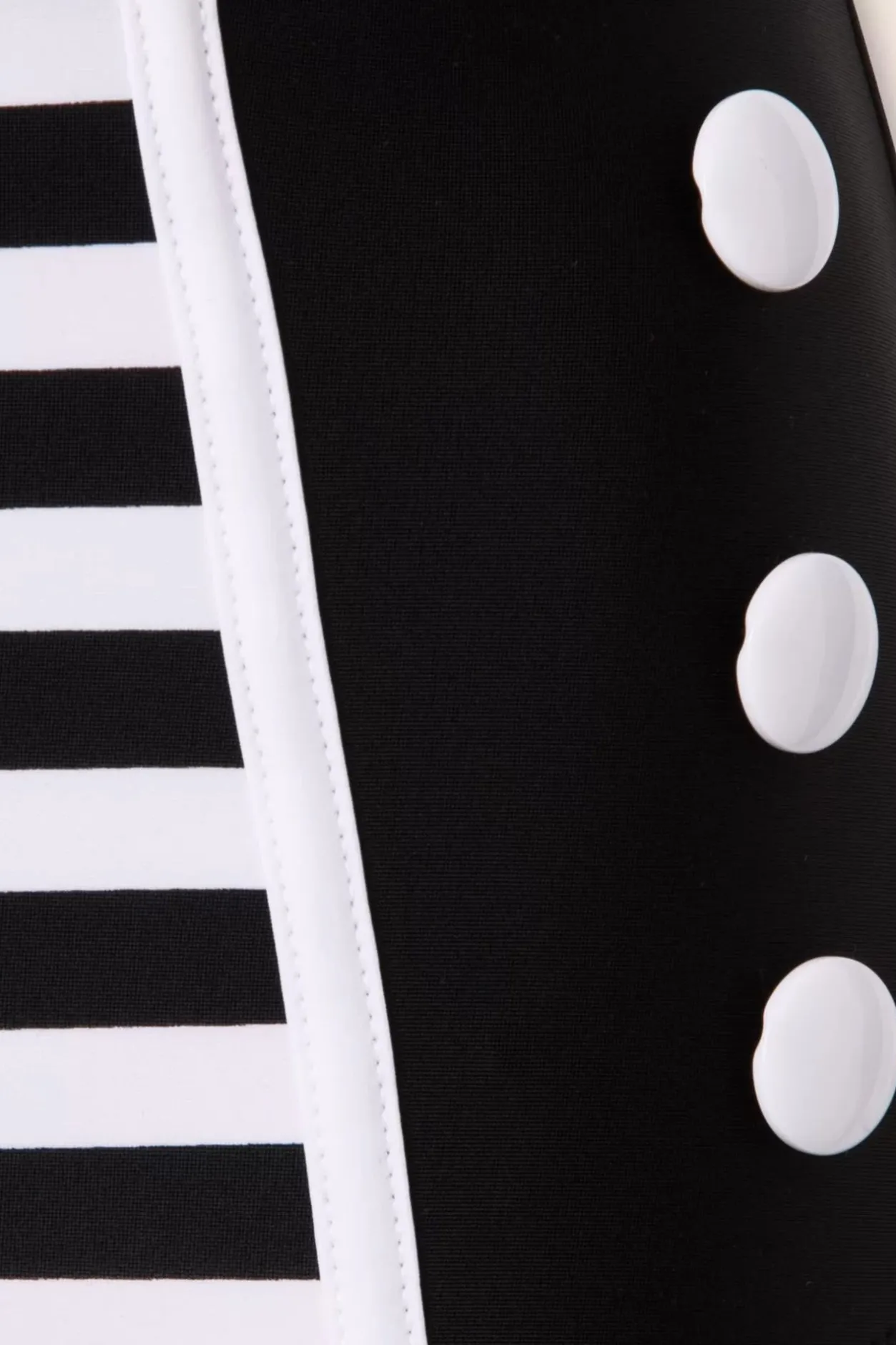 Die Ene Leuke Marinier? Laat Zijn Hart Smelten Met Deze 50S Joelle Stripes Bikini Pants In Black And White! Dit Broekje Met Contrasterende Witte Streepjes En ‘Faux’ Knoopjes Wordt Hoog In De Taille Gedragen Waardoor Jij Een Onweerstaanbaar Vrouwelijk Silhouet Krijgt En Tevens Eventuele Buikprobleempjes Verdoezelt. Uitgevoerd In Een Comfortabel, Stretchy Stofje Dat Heerlijk Draagt En Perfect Aansluit. We Like Sailors… But We Love The Sailor Style!