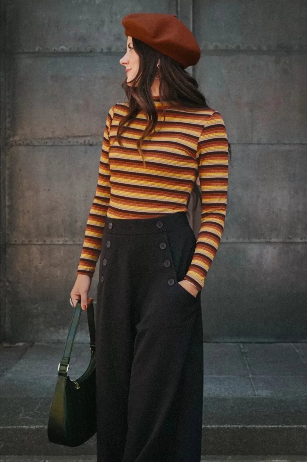 “Looking For A Statement Trouser To Add To Your Everyday Wardrobe?” Dan Is Deze 40S Carlie Swing Trousers In Zwart Echt Iets Voor Jou! Ze Brengt Met Haar Vrouwelijke Hoge Taille, Charmante Sierknopen En Elegante Wijde Pijpen Fourties ‘swing’ In Je Garderobe ;-). Ze Is Uitgevoerd In Een Soepelvallende, Zwarte Stof Met Een Lichte Stretch Die Verrassend Comfy Draagt. Klaar Om Een Statement Te Maken?