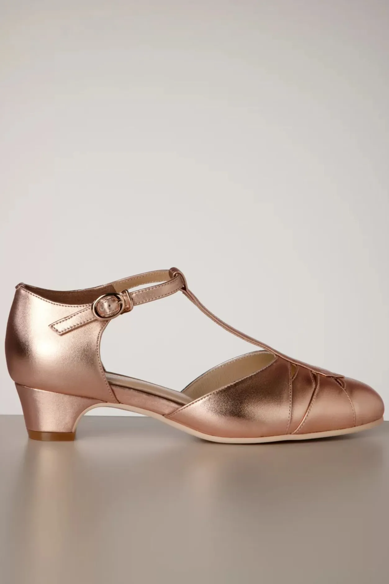 ”Made For Glittering Gowns And Glitzy Parties!” Geïnspireerd Op De Mondaine Badplaats Monaco… Deze Pumps Zijn Uitgevoerd In High Quality Rosé Goud Leder Met Een Speels T-Strap Bandje, Sierlijke Uitsneden En Een Elegant Laag Hakje.