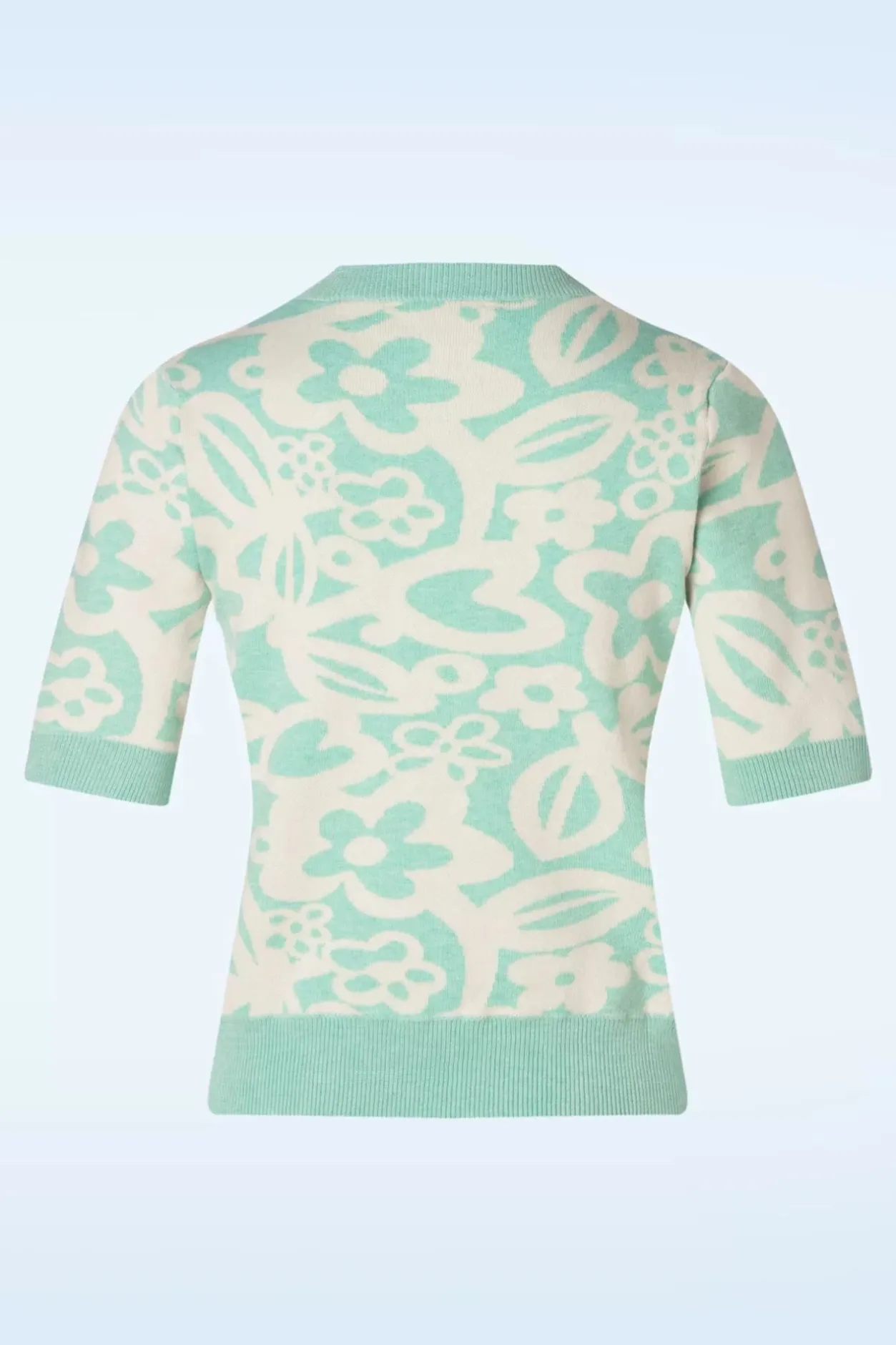Bloei Op In Deze Freya Jumper! Ze Heeft Een Ronde Halslijn, Speelse 1/2 Mouwen En Een Retro Bloemenpatroon. Uitgevoerd In Een Dikkere Maar Soepele En Stretchy, Fijngebreide, Mintblauwe Viscose. “Cute, Cuter, Cutest!”