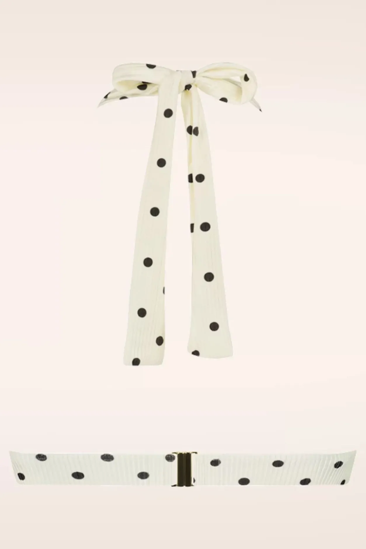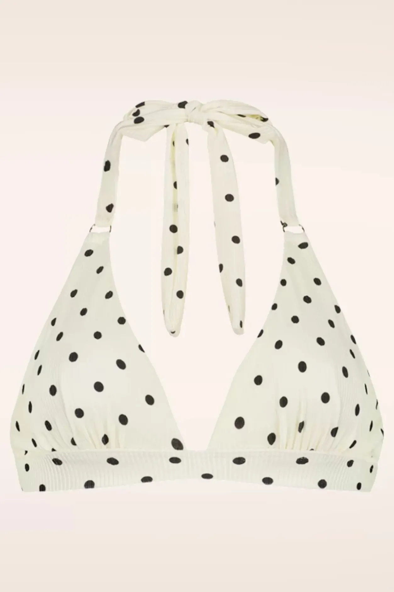 Met ‘stip’ Op Nummer 1 Dit Seizoen! 😉 Deze Halter Bikini Top Is Voorzien Van Padded Cups Die Je Voorzien Van Een Prachtig Decolleté. Afgewerkt Met Plooitjes En Uitgevoerd In Een Comfy, Perfect Aansluitend Ivoorwit Stofje Met Een Mooie Glans En Een Print Van Zwarte Polkadots.