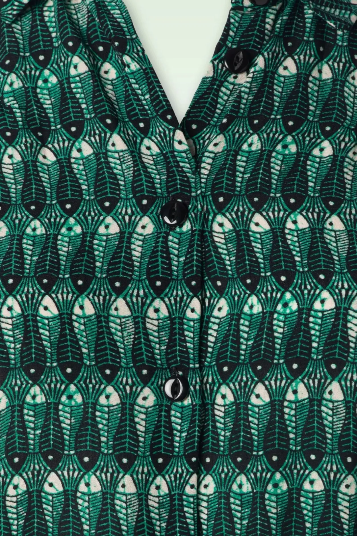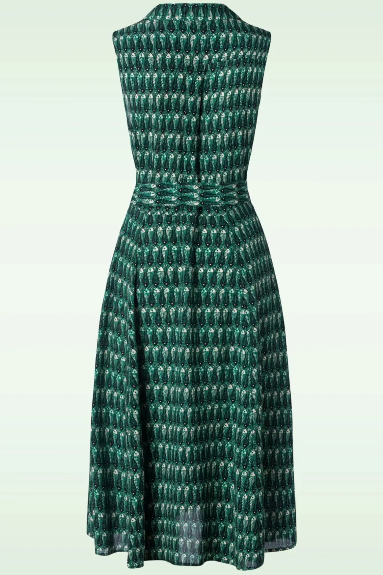 Genieten Van Die (Eerste) Zonnestralen Doe Je In Deze Geweldige Flowy Doorknoop Jurk. Uitgevoerd In Luchtig En Soepel Ecovero Viscose (Stretcht Niet) Met Een Print Van Visjes In Zwart, Zeegroen En Wit.