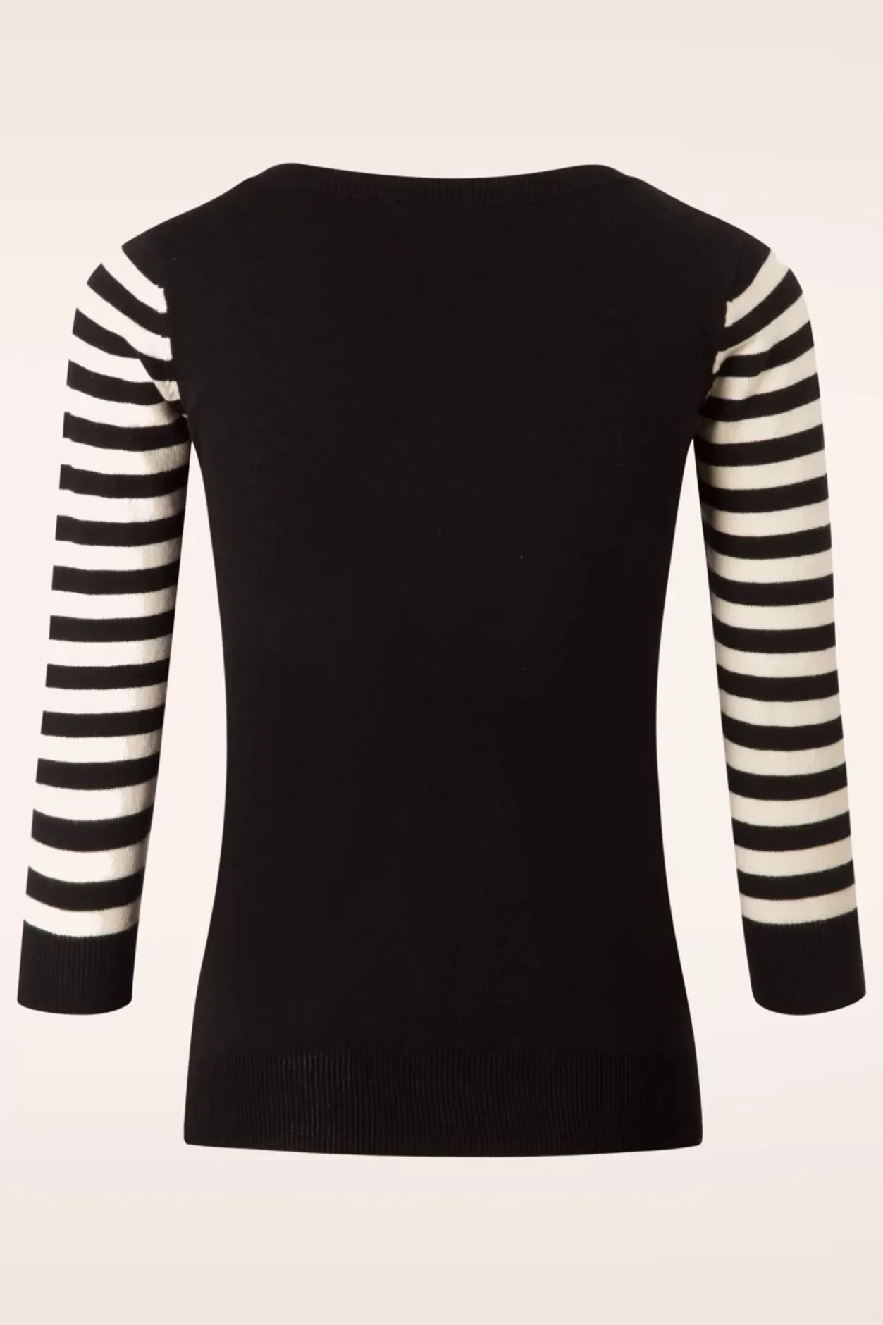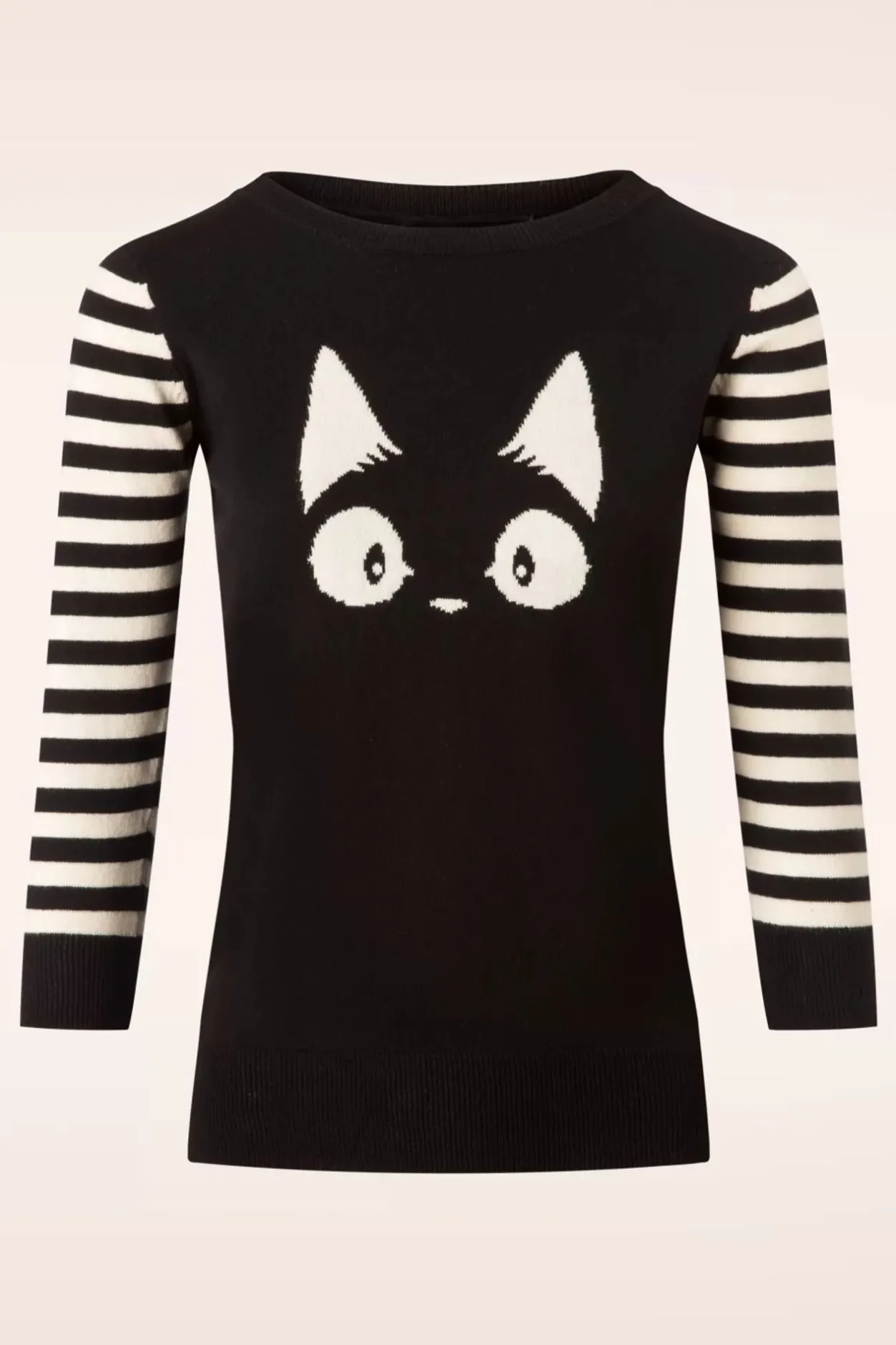Go Retro Met Deze 60S Debbie Cat Striped Sweater Inblack! Online In Nederland, Duitsland En Frankrijk Exclusiefverkrijgbaar Bij Topvintage! Een Blik Op Dit Truitje Is Genoeg Om Ons Hartjesneller Te Laten Kloppen, Me-Ow… Ze Heeft Een Klassieke Snit Met Een Rondehalslijn, Gestreepte 3/4 Mouwen En Stretchy Ribboord Voor Een Mooie Pasvorm.Uitgevoerd In Een Heerlijk Soepele, Fijngebreide, Stretchy, Zwarte 100% Katoenvoorzien Van Een Schattig Ivoorkleurig Kattenkopje. In Één Woordcat-Tas-Tic!