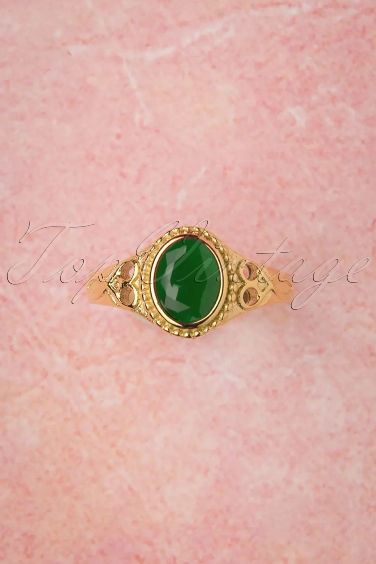 Wachten Tot Je Een Ring Krijgt? Nee Joh, Deze 50S Selflove Ring In Gold And Green Koop Je Gewoon Lekker Voor Jezelf! Uitgevoerd In Goudkleurig Metaal En Voorzien Van Sierlijke Uitsneden En Een Smaragdgroene, Glazen Steen In Het Midden. ”Put A Ring On It!”