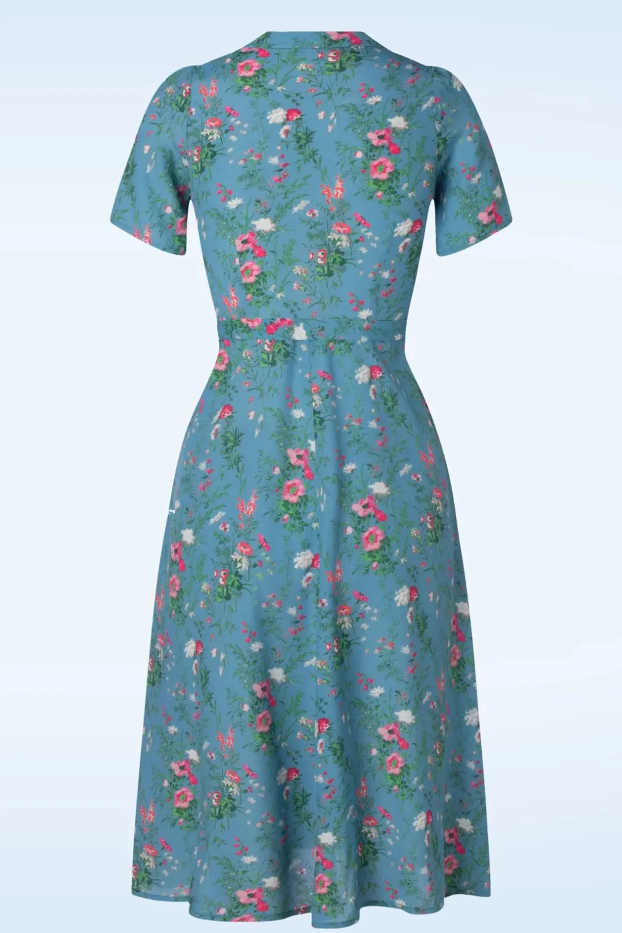 Voeg Wat ‘Fourties Flair’ Toe Aan Je Garderobe Met Deze Revers Jurk! Ze Heeft Een V-Halslijn Met Een Speels Revers Kraagje, Korte Pofmouwen En Een Reeks Grote Knopen. Het Striklint Accentueert Je Taille Voor Een Super Vrouwelijk Silhouet. Uitgevoerd In Een Soepele, Non-Stretchy, Luchtblauwe Viscose (Ecovero) Voorzien Van Lieflijke Bloemen Die Heerlijk Draagt. ”I Feel Pretty, Oh, So Pretty!”