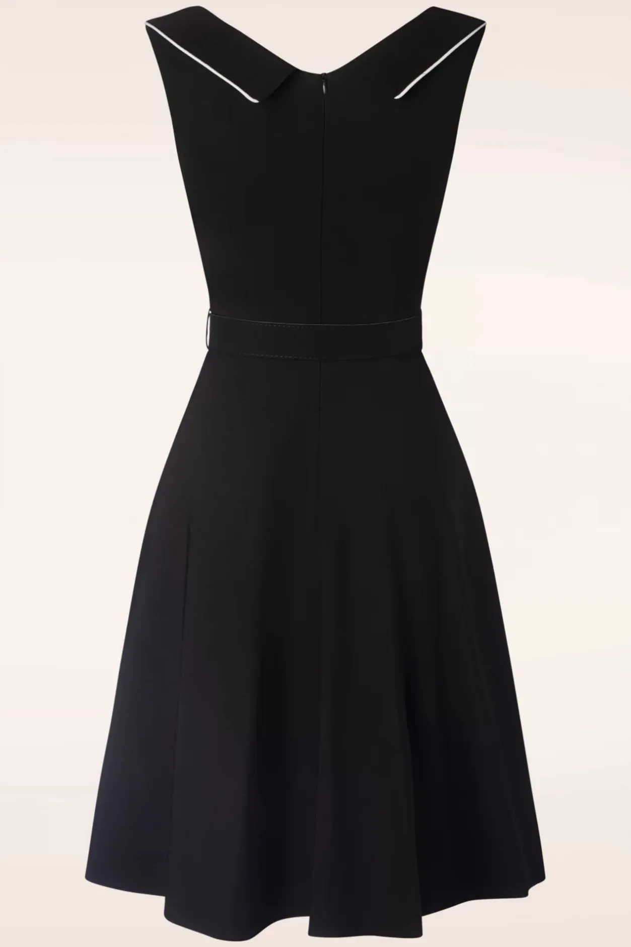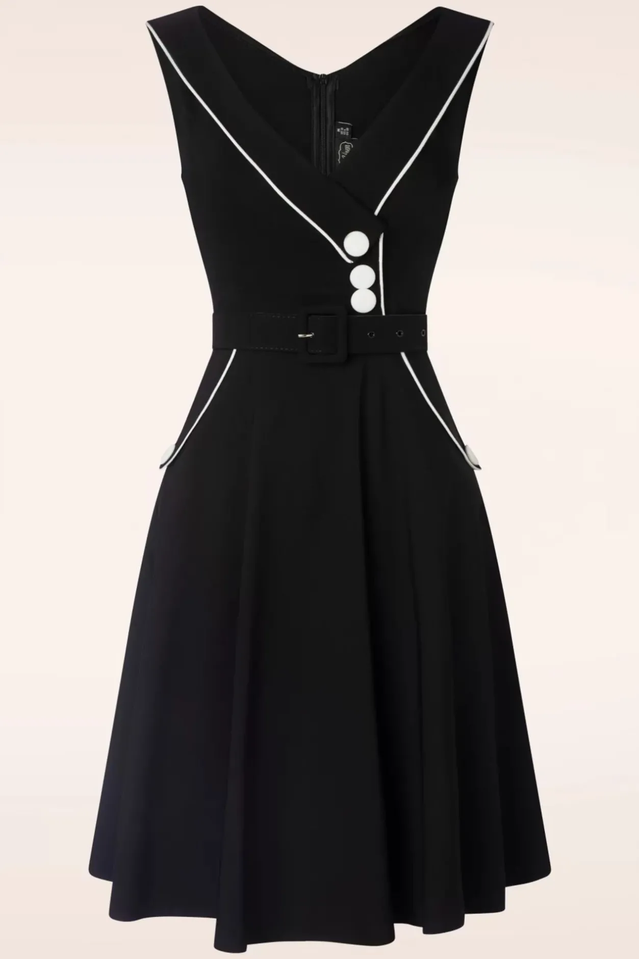 Voel Je Een Vintage Beauty In Deze Marica Herringbone Swing Dress In Black! Ze Heeft Een Eye-Catching Kraag Die Uitloopt In Een Subtiele V-Hals Met Een Speelse Overslag En Een Reeks Witte Stoffen ‘Faux’ Knopen, Très Chique! Vanaf De Taille Gaat Ze Over In Een Flatterende Swing Rok Voorzien Van Een Afneembare Riem, Sierlijke Steekzakken Die Afgewerkt Zijn Met Witte Biesjes En Sierknopen. Ze Is Uitgevoerd In Een Dikke Maar Soepel Vallende, Zwarte Stof Voorzien Van Een Klassiek Visgraat Patroon, Met Een Fijne Stretch Waardoor Ze Een Genot Is Om Te Dragen. Elegantie Ten Top!