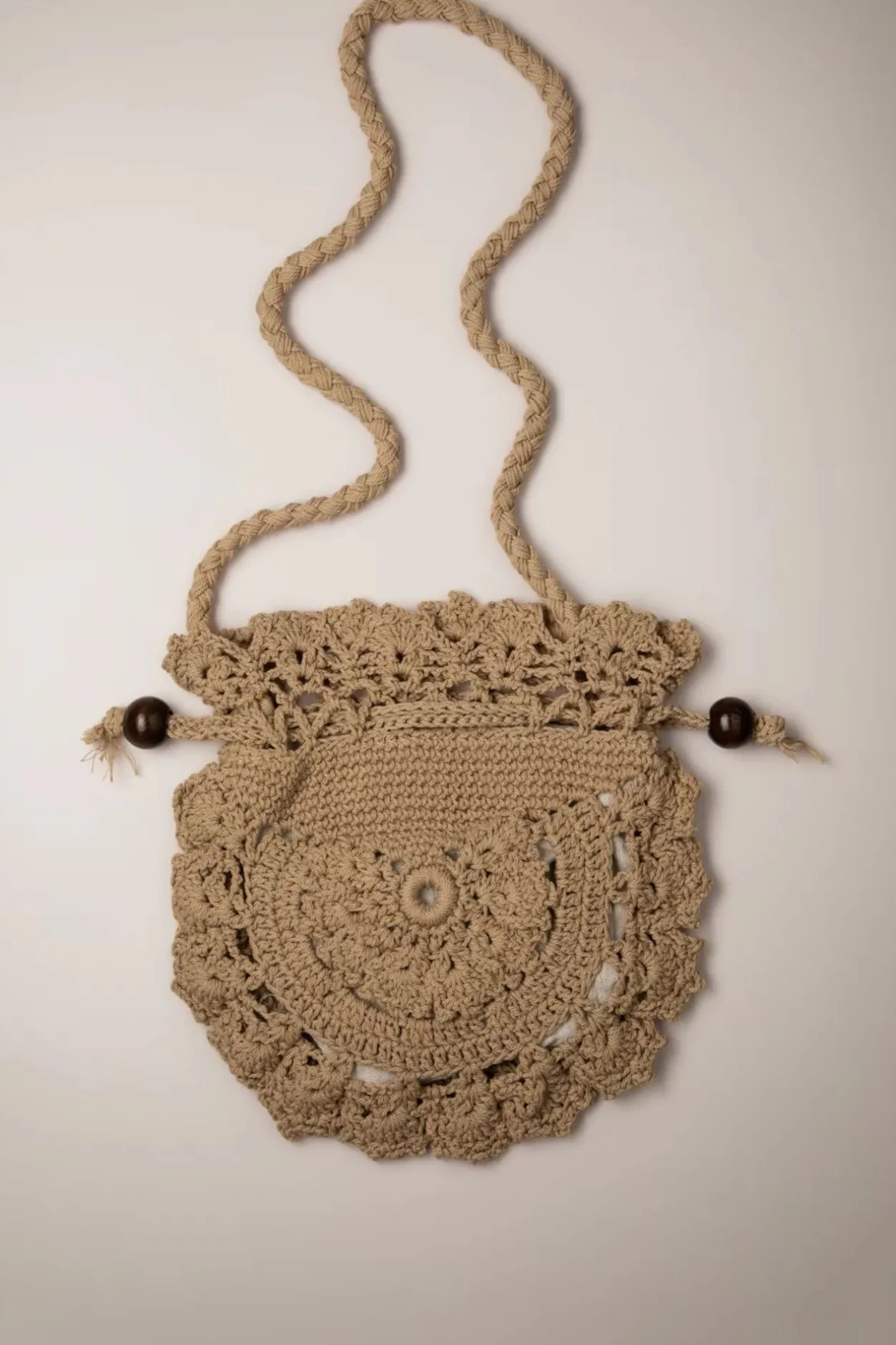 ”Crochet… All Day, Everyday!” 😉 Deze Zandkleurige Gehaakte Schoudertas In De Vorm Van Een Buideltje Geeft Iedere Outfit Een Boho Vibe En Is Afgewerkt Met Een Trekkoord Voorzien Van Houten Kralen.