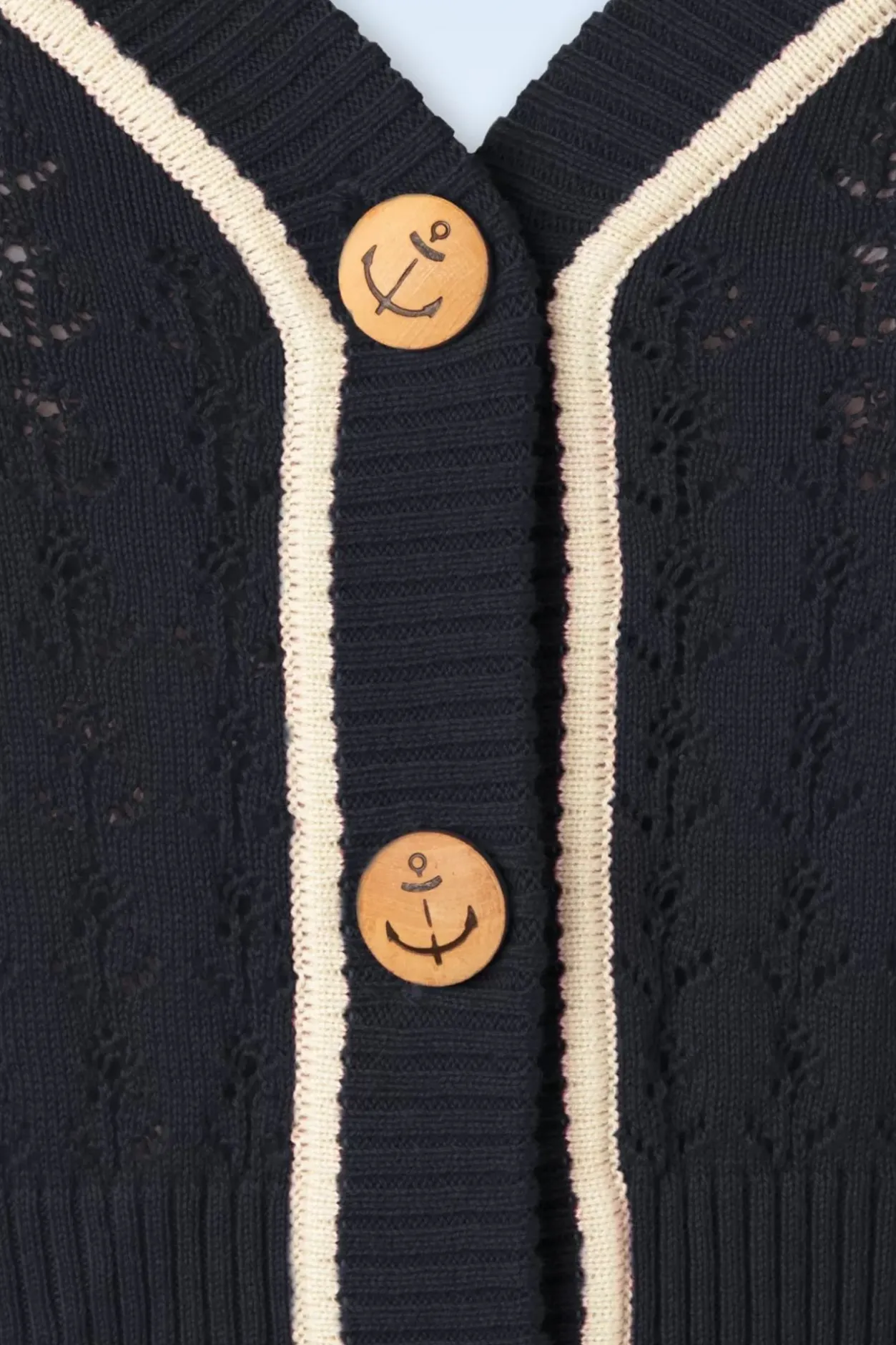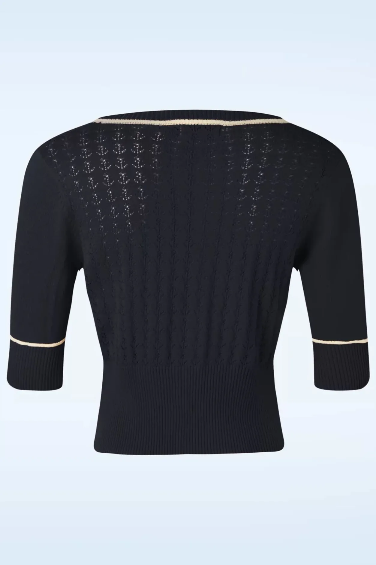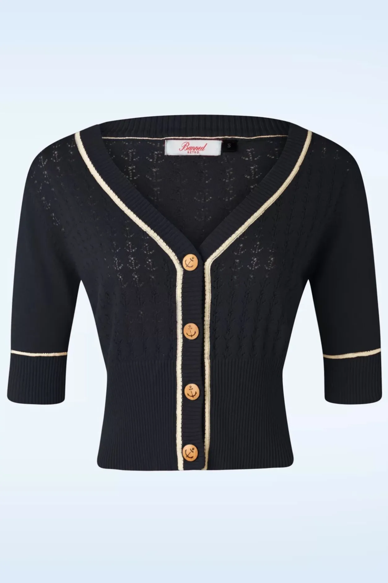 Gaat Jouw Hartje Ook Sneller Kloppen Van Deze 50S Boat Club Cardigan In Navy? 😉 Deze Cardigan Heeft Een V-Halslijn, 1/2 Mouwen En Houten Knopen Met Ankertjes. Uitgevoerd In Een Zachte, Fijngebreide, Navyblauwe Viscose-/Katoenmix Met Een Heerlijke Stretch, Een Opengewerkt Ankerpatroon En Crèmekleurige Biezen. ”Love At First Sight!”