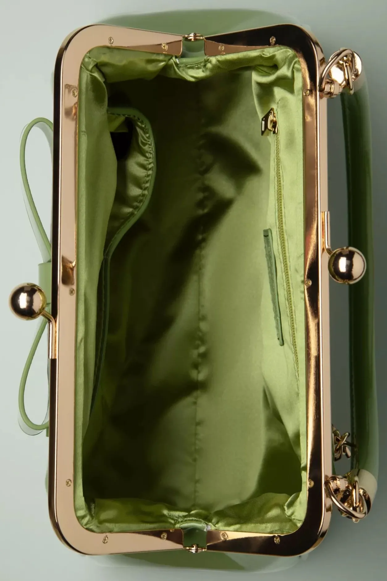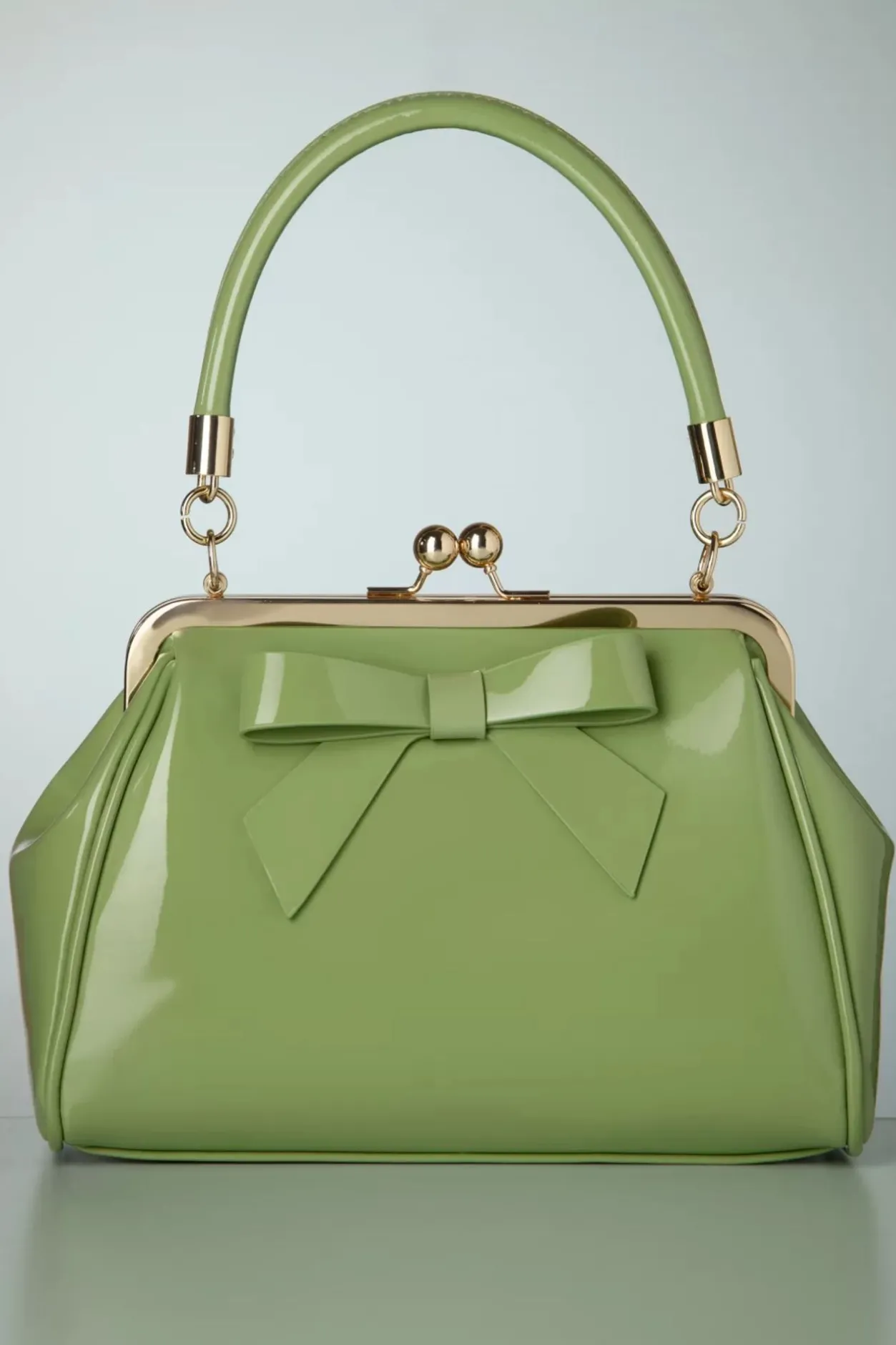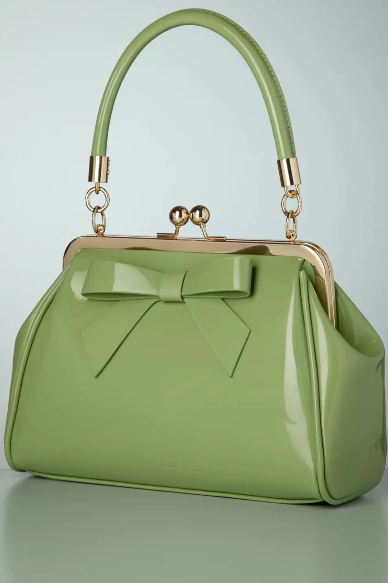 ”California… Knows How To Party!” Dit Kleine Zusje Van De Klassieke American Vintage Bag Heeft Een Opvallende Goudkleurige Metalen Klipsluiting Voor Een Echte Vintage Look En Is Uitgevoerd In Bleekgroen Imitatie Lakleder Afgewerkt Met Een Schattige Strik.