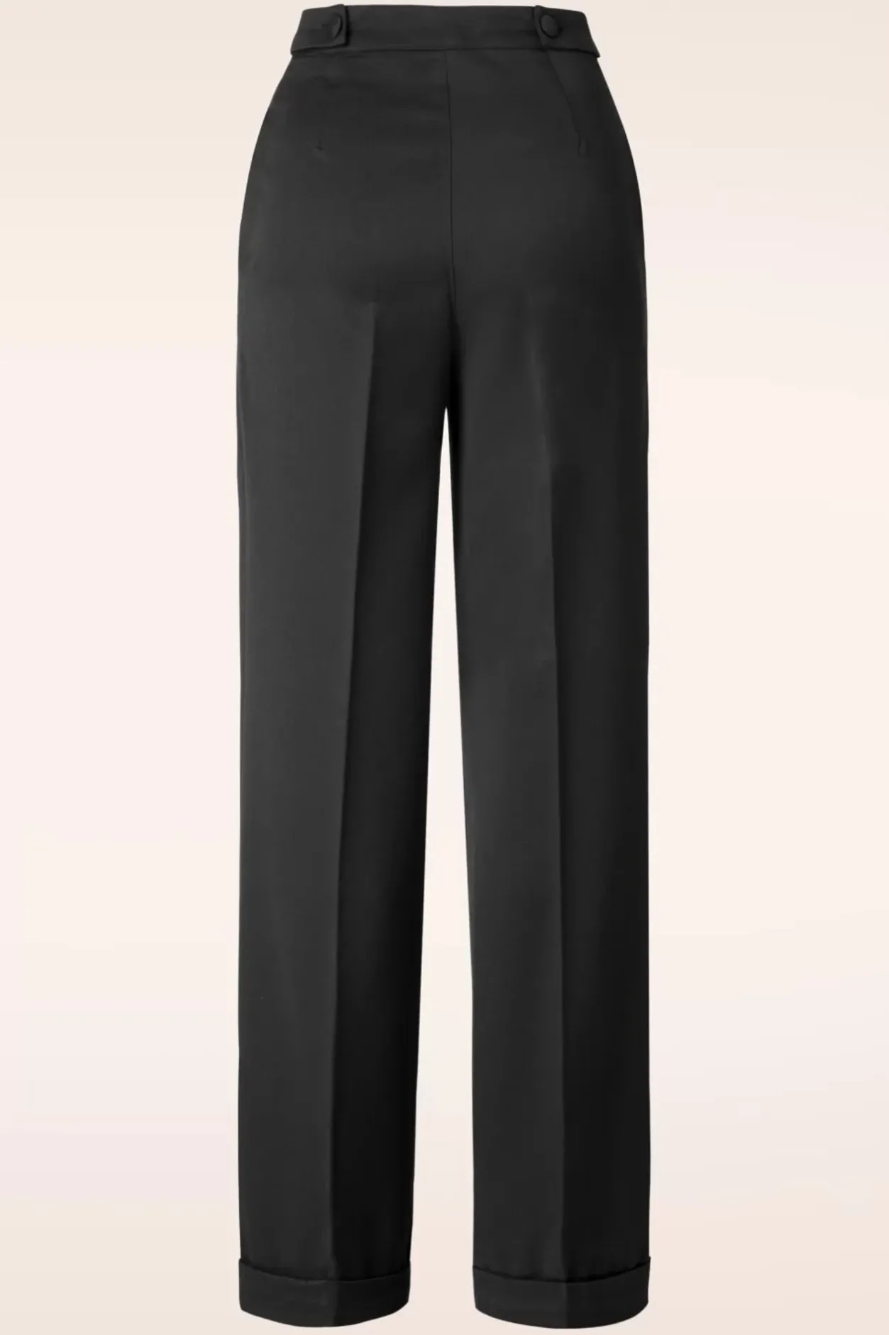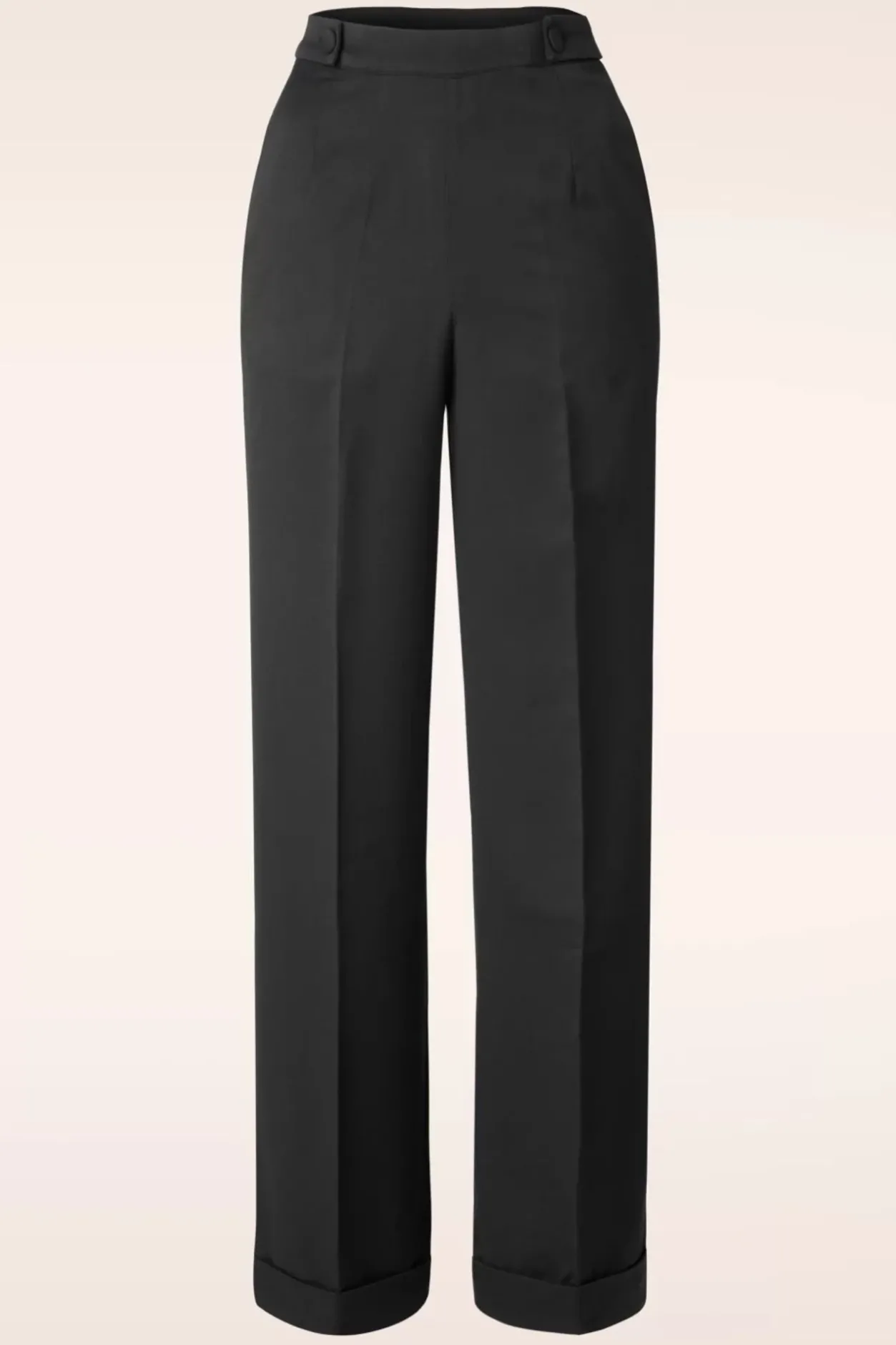 De 40S Party On Classy Trousers In Black Is Geïnspireerd Op De Pantalons Die De Vooruitstrevende Dames In De Jaren 40-50 Droegen! De Vrouwelijke Hoge Taille Vormt Een Mooi Contrast Met De Wijde Pijp En Heeft Een Super Afkledend Effect, Juist Als Je Vollere Heupen/Billen Hebt. De Knoopdetails Aan De Zijkant Maken Het Geheel Helemaal Af. Uitgevoerd In Een Soepel Vallend, Zwart Stofje Met Een Lichte Stretch En Afgewerkt Met Een Chique Omslagje Bij De Pijpen. Combineer Met Een Witte Blouse En Pumps Voor De Perfecte Zakelijke Look In Retro Stijl!