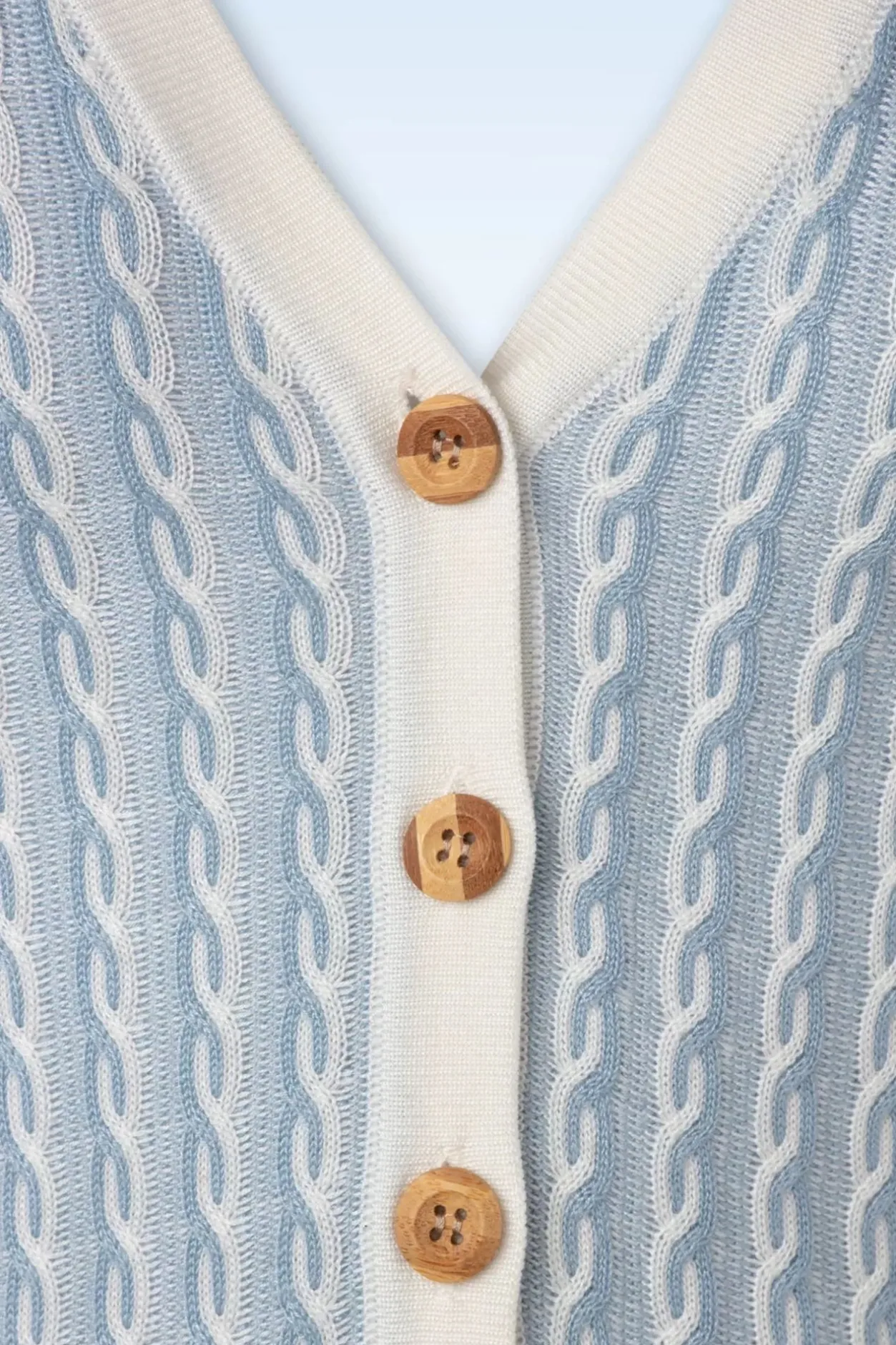 ”Buying This 60S Regatta Race Stripe Knit Cardigan In Blauw Will Leave You With No Regretta!” 😉 Deze Cardigan Heeft Een V-Halslijn, 3/4 Mouwen En Een Reeks Houten Knopen. Uitgevoerd In Een Zachte, Fijngebreide, Lichtblauwe Viscosemix Met Een Heerlijke Stretch En Is Voorzien Van Een Kabelpatroon Met Ivoorwitte Details. Je Sixties Outfit Afmaken Doe Je Met Deze Cutie!