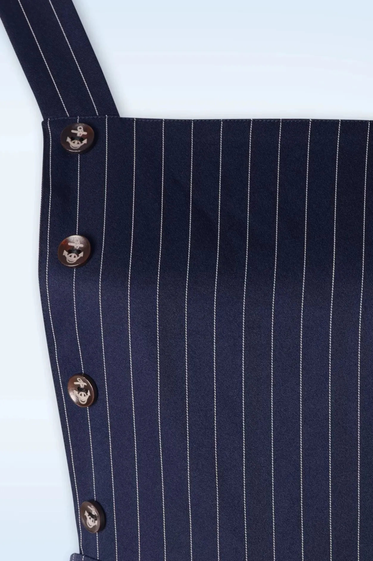 Lang Nadenken Over Je Outfit Behoort Tot Het Verleden Met Deze Dungarees! Uitgevoerd In Een Stevige Maar Soepele, Navyblauwe Stof (Stretcht Niet) Met Een Witte Krijtstreep Voor Een Heerlijk Draagcomfort En Is Afgewerkt Met ‘Faux’ Knopen Voorzien Van Ankertjes. Een Top Of Blouse Eronder, De Juiste Schoenen Erbij En Je Eye-Catching Retro Look Is Compleet!