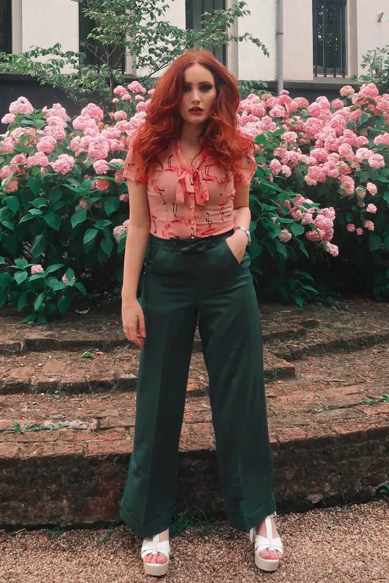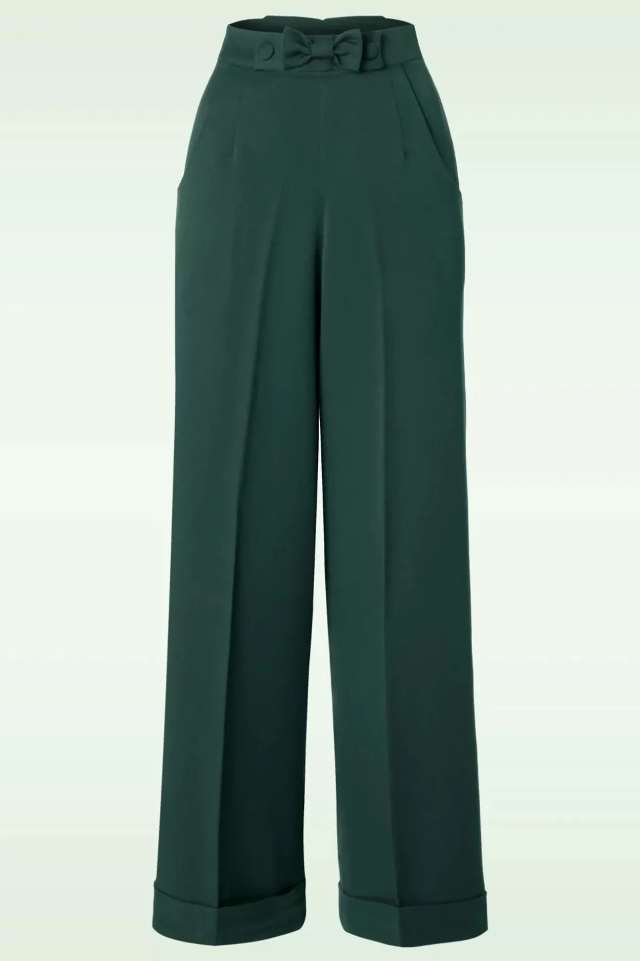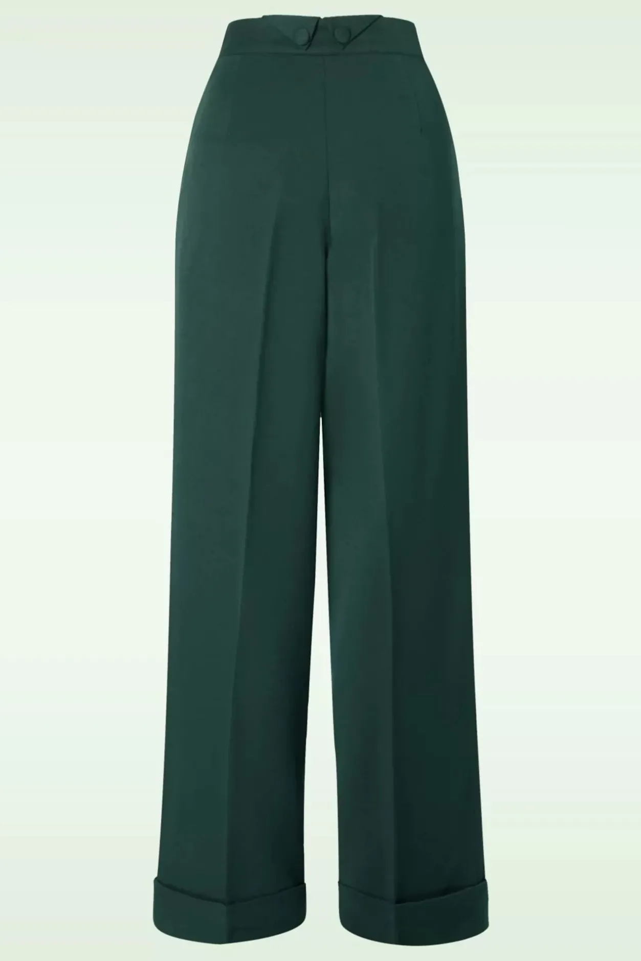 De 40S Hidden Away Trousers In Teal Is Geïnspireerd Op De Pantalons Die De Vooruitstrevende Dames In De Jaren 40-50 Droegen! De Vrouwelijke Hoge Taille Vormt Een Mooi Contrast Met De Wijde Pijp En Heeft Een Super Afkledend Effect, Ook Als Je Vollere Heupen/Billen Hebt. Het Strikje En Knoopdetail Aan De Achterzijde Maken Het Geheel Helemaal Af. Uitgevoerd In Een Soepel Vallende, Tealgroene Stof Met Een Lichte Stretch En Afgewerkt Met Een Chique Omslagje Bij De Pijpen. Combineer Met Een Blouse En Pumps Voor De Perfecte Zakelijke Look In Retro Stijl!