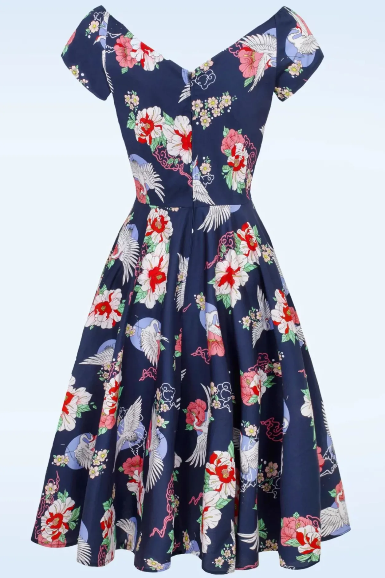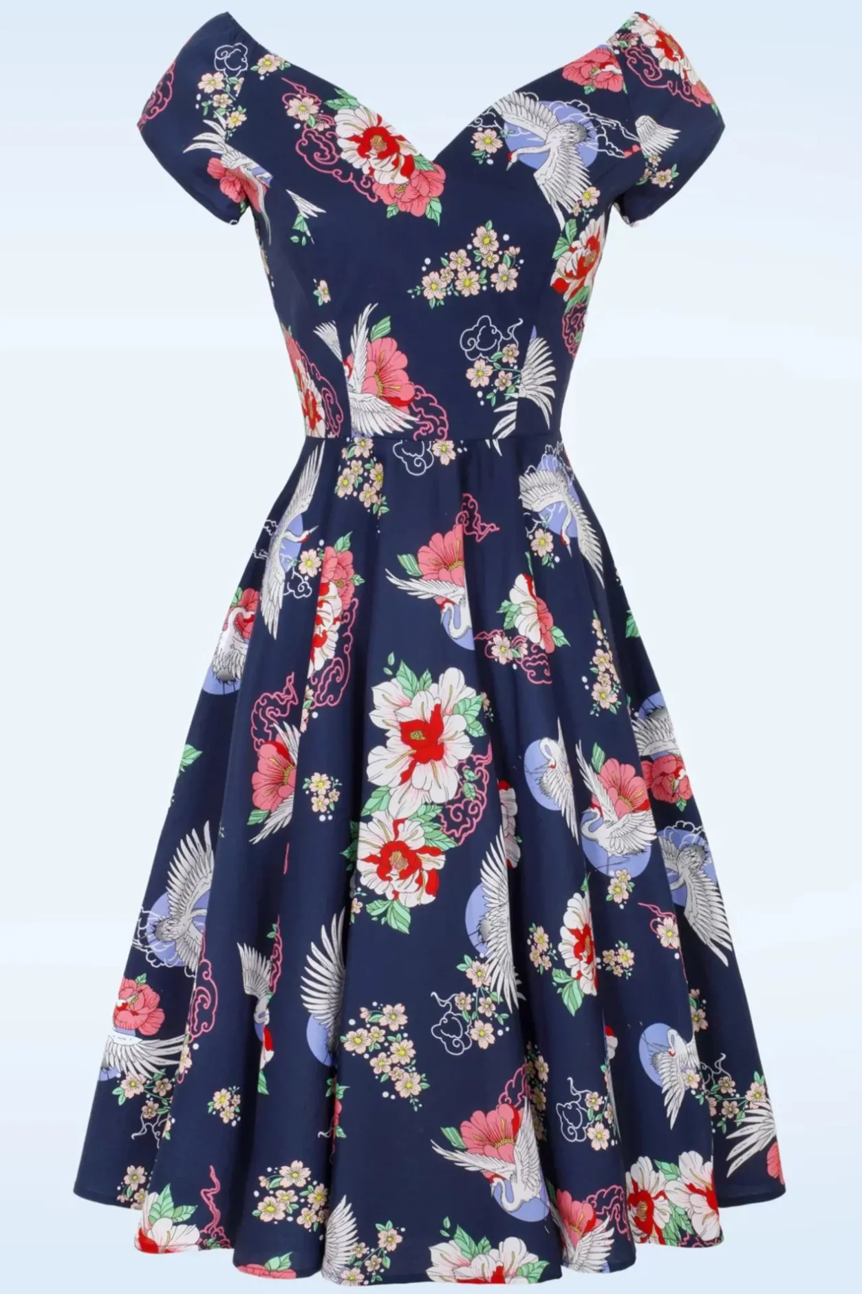 Nieuwe Lente/Zomercollectie ~ ”Cranes Symbolize Happiness And Eternal Youth!” Ze Is Uitgevoerd In Een Luchtige En Soepele Marineblauwe Katoenmix Voorzien Van Een Aziatisch Geïnspireerde Print Met Bloemen En Kraanvogels. ”Happiness Looks Good On You!” 😉