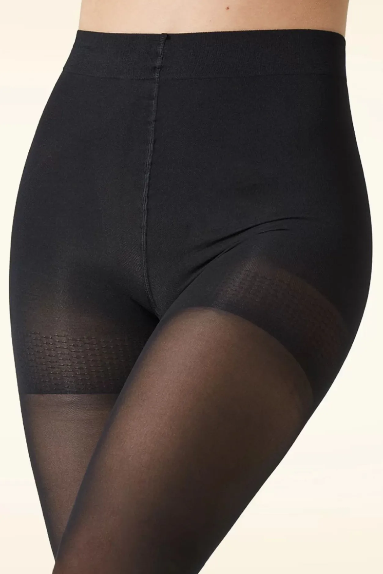 Deze Seattle Classic Shaping Panty Black Van Cette Heeft Het Allemaal; Prachtige Semi-Opaque (30 Denier) Panty Met Figuur Corrigerend Broekje (Afslankend Effect Voor Buik, Billen En Dijen), Satijnglans, Dubbel Omsponnen Lycra, Katoenen Kruisje, Versterkte Tippen En Platte Naden. Perfect Onder Al Onze Nauwsluitende Pin Up Style Kleding!