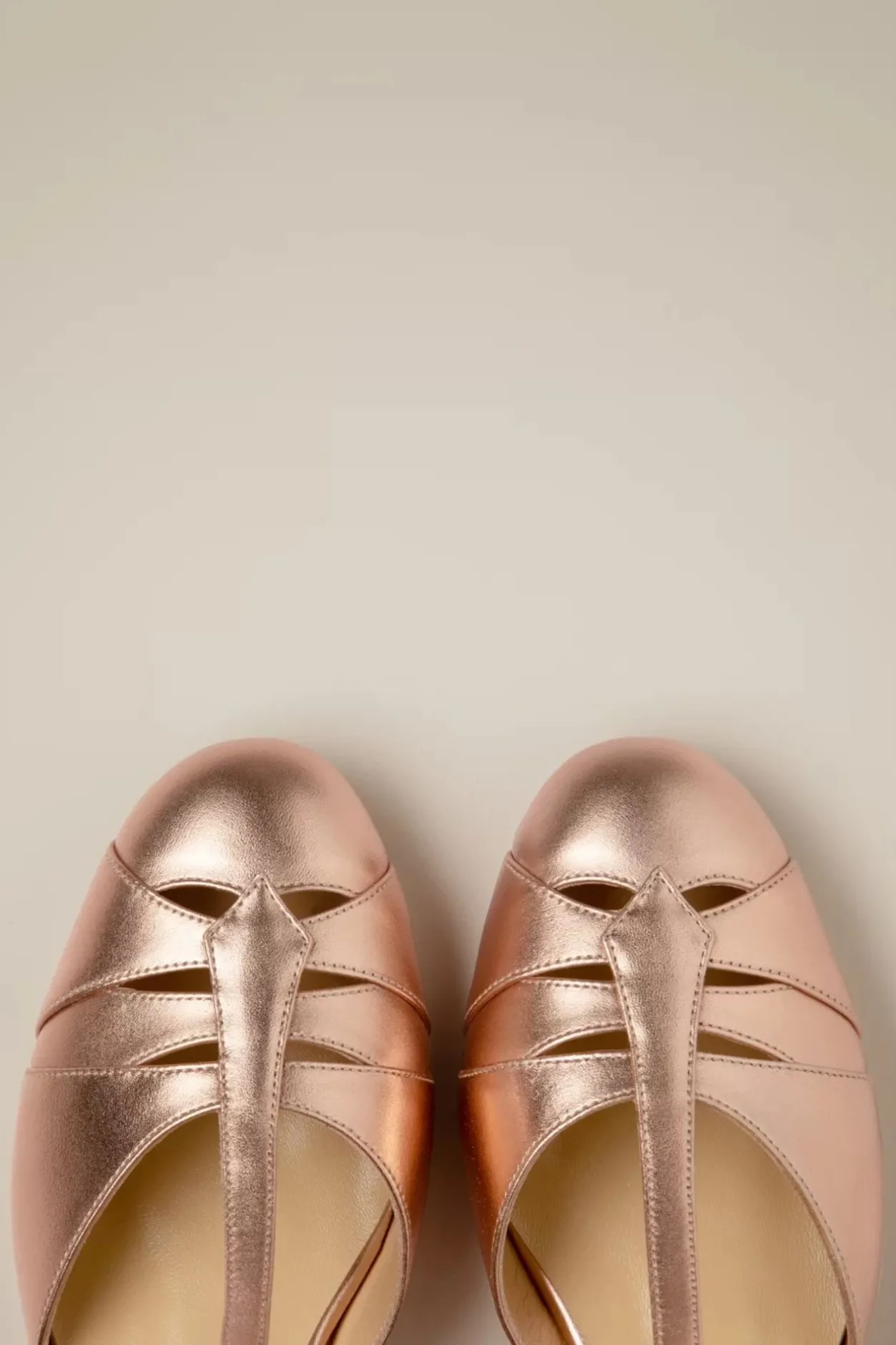”Made For Glittering Gowns And Glitzy Parties!” Geïnspireerd Op De Mondaine Badplaats Monaco… Deze Pumps Zijn Uitgevoerd In High Quality Rosé Goud Leder Met Een Speels T-Strap Bandje, Sierlijke Uitsneden En Een Elegant Laag Hakje.