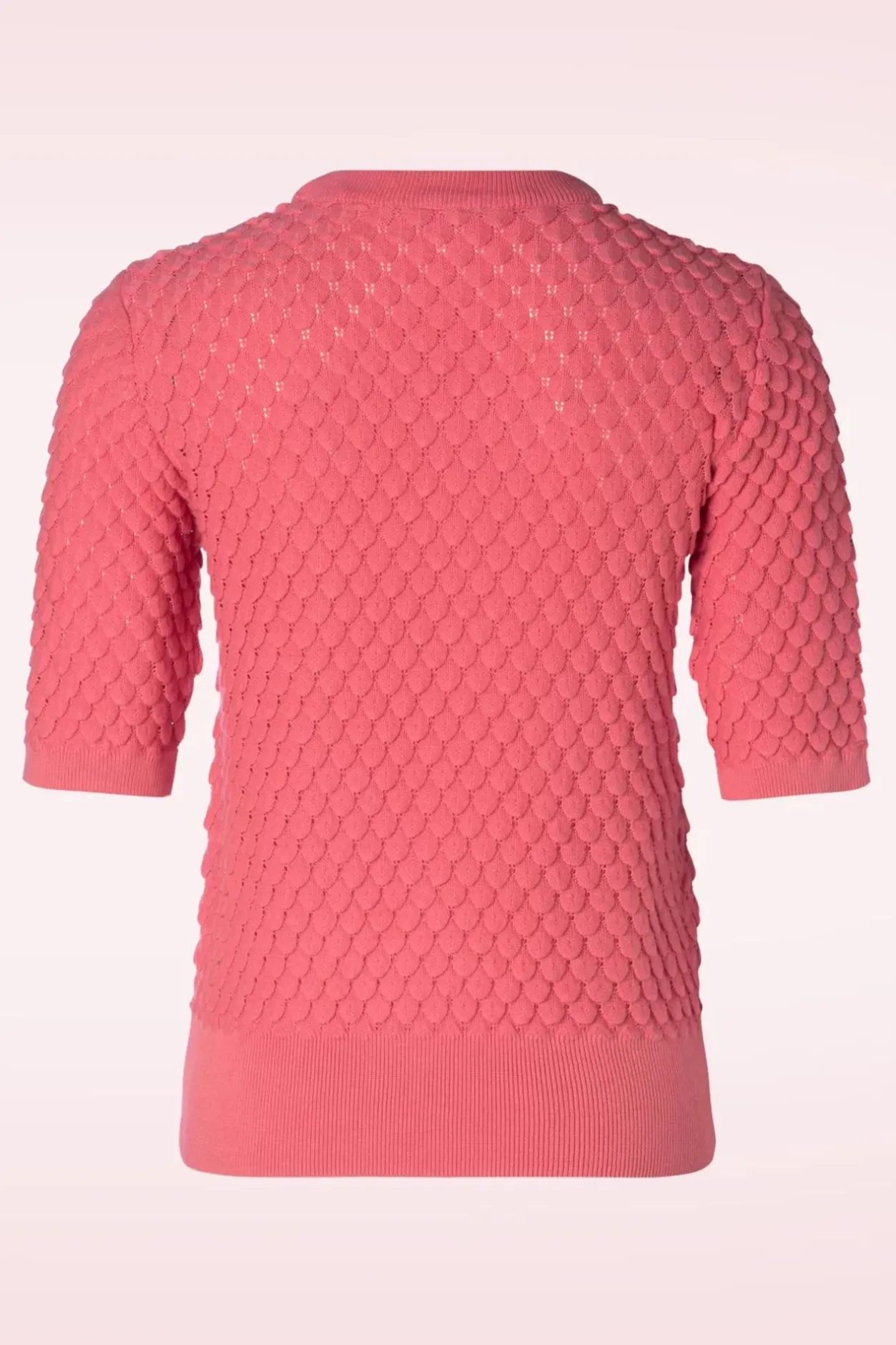 ”Hello Pretty!” Deze Schattige Top Is Uitgevoerd In Een Fijngebreide, Soepele En Stretchy, Organische Katoen In Koraalroze, Voorzien Van Een Geschulpt Patroon.