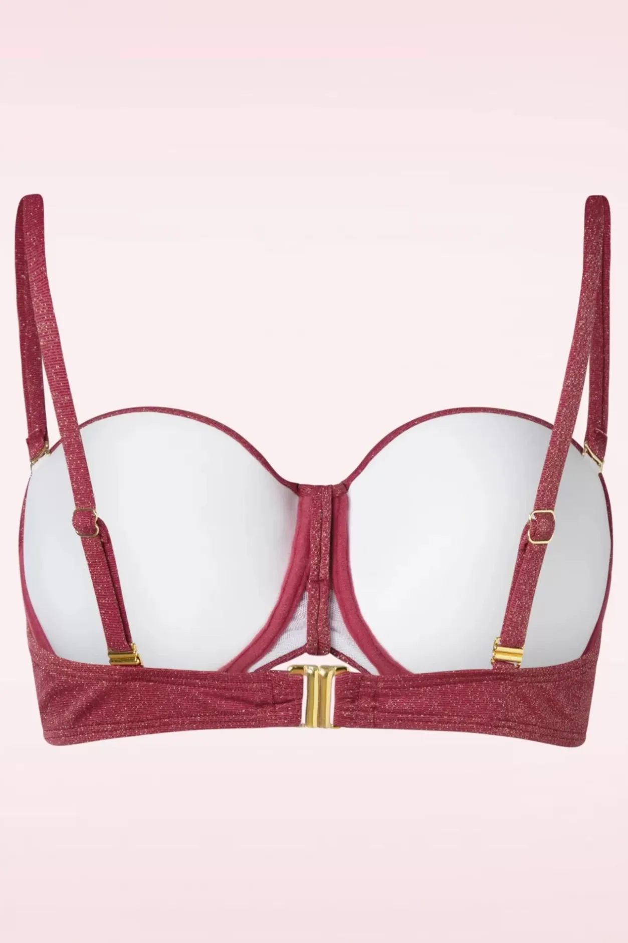 Het Strand Is Je Persoonlijke Catwalk Als Je Deze Summer Glam Padded Bikini Top In Burgundy Draagt! Ze Is Voorzien Van Een Beugel En Padded Cups Die Zorgen Voor Steun En Je Voorzien Van Een Prachtig Decolleté. Je Kunt Deze Top Op Meerdere Manieren Dragen; Met Schouderbandjes, Gekruist Op De Rug Of Als Halter. Afgewerkt Met Plooitjes En Een Vast Strikdetail Tussen De Cups. Uitgevoerd In Een Comfy, Perfect Aansluitend Bordeauxrood Stofje Met Een Subtiele, Goudkleurige Glitter Voor Een Beetje Glamour In The Sun. ”Too Glam To Give A Damn!”