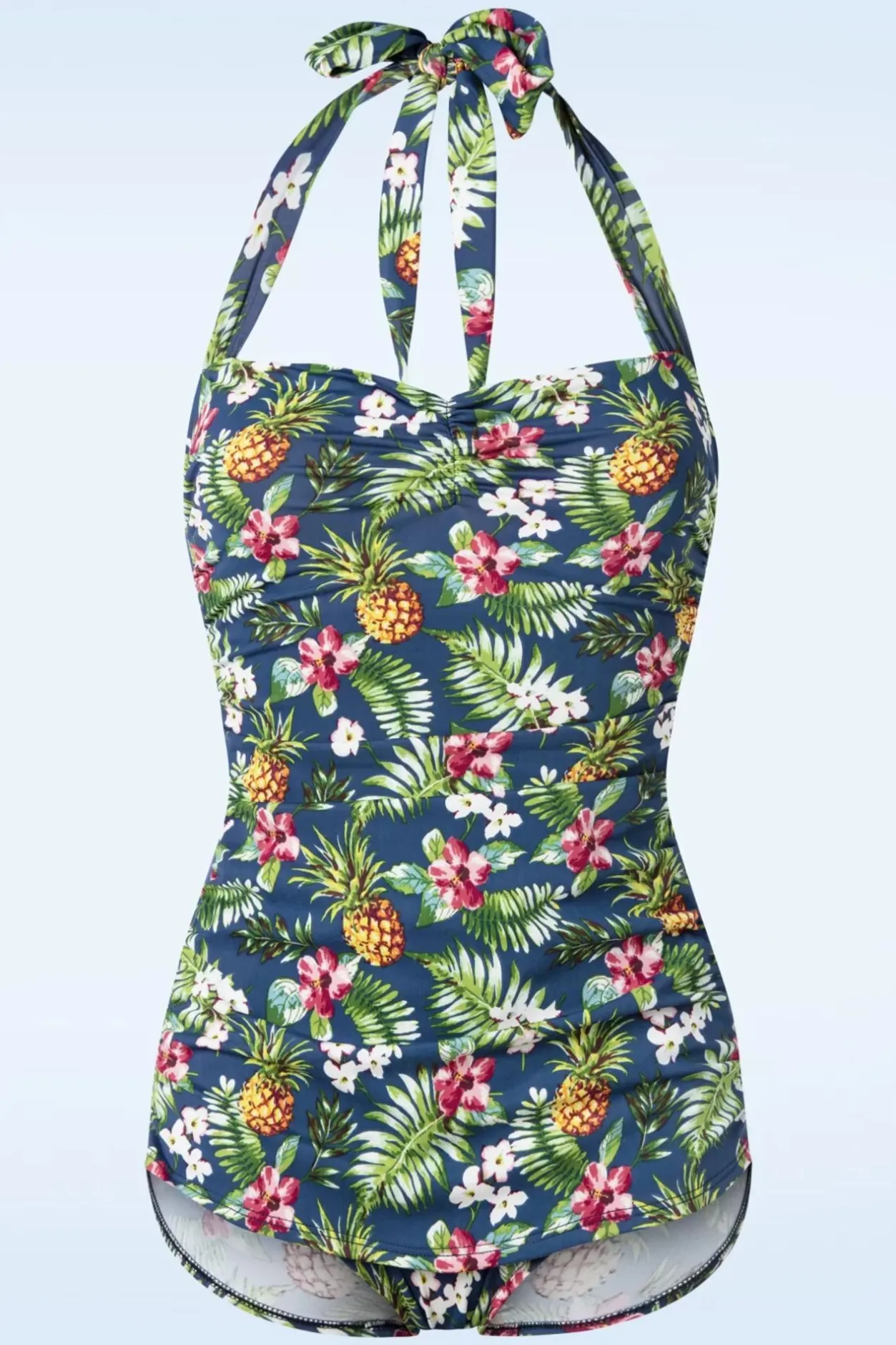 “Dear Beach, I Think About You All The Time!” In Dit Retro Badpak Krijg Jij Alleen Maar Meer Zin In De Zomer! Uitgevoerd In Een Zacht En Stretchy Blauw, Glanzend Stofje Met Een Tropische Print Dat Heerlijk Draagt.