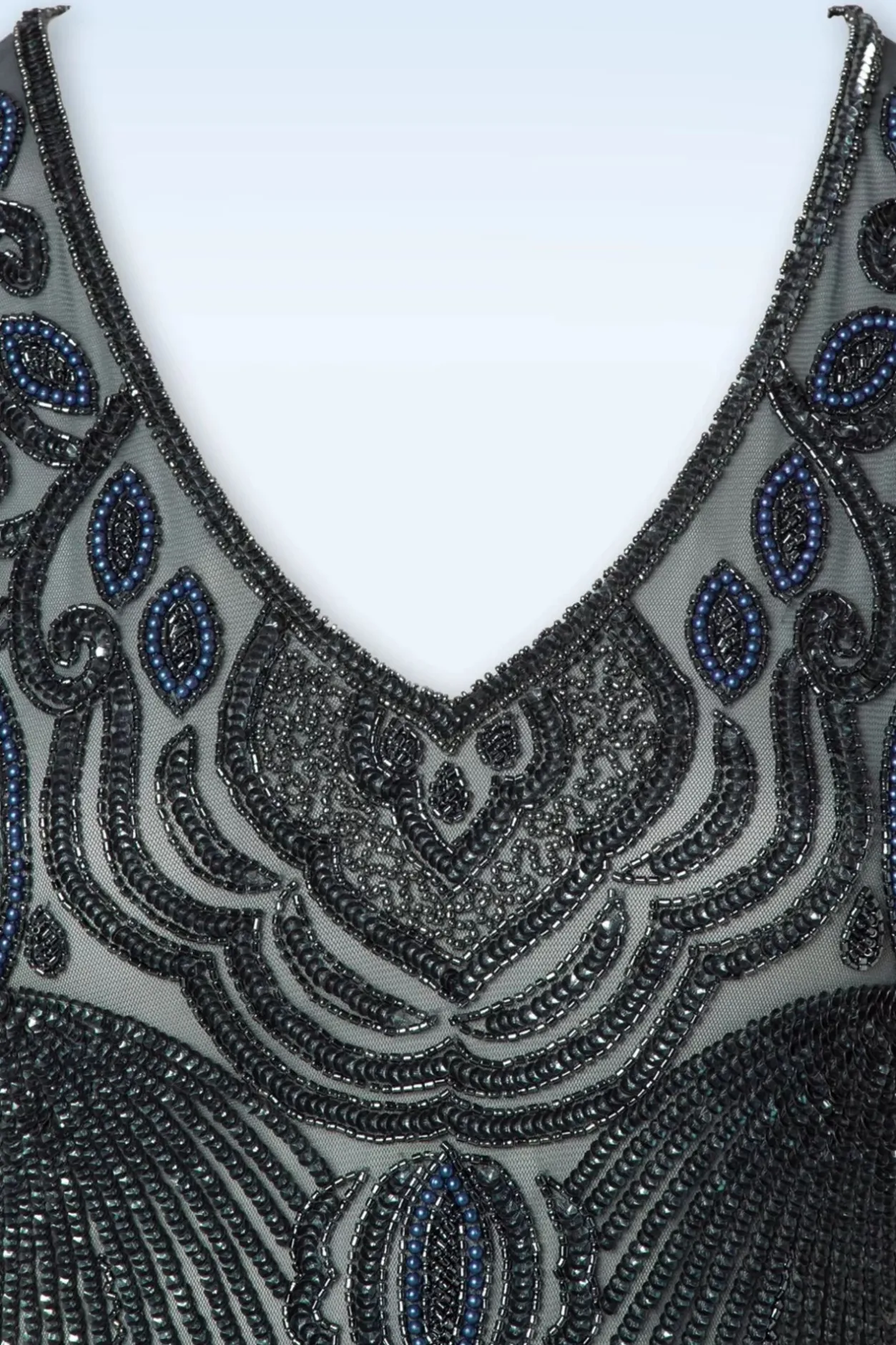 Deze 20S Marta Flapper Dress In Blue And Grey Is Een Prachtige Met De Hand Bewerkte Reproductie Van De Elegante Flapper Dresses Uit De Jaren 20! Laat Je Meenemen Naar De Lang Vervlogen Romantische En Glamorous Tijden! Deze Beauty, Je Haren Opgestoken Met Een Sprankelende Haar Clip En Een Droomman Aan Je Arm… Picture Perfect! Deze Showstopper Is Bezaaid Met Minuscule, Glimmende Glaskraaltjes En Pailletten In Grijs En Blauw Die Er Met De Hand Opgestikt Zijn, Wow! De Top Heeft Een Diepe V-Hals En Franjes Van Kraaltjes Langs De Korte Mouwtjes. Deze Beauty Heeft Geschulpte Randjes Langs De Onderkant En Valt Met Haar Loose-Fit Precies Zoals Een Flapper Dress Hoort Te Zitten. Ze Is Uitgevoerd In Een Grijsblauwe, Semi-Doorschijnende, Stretchy Stof En Is Gevoerd Voor Extra Draagcomfort. Nu Maar Hopen Dat Je Date Net Zo Galant Is Als De Mannen Van Vroeger 😉