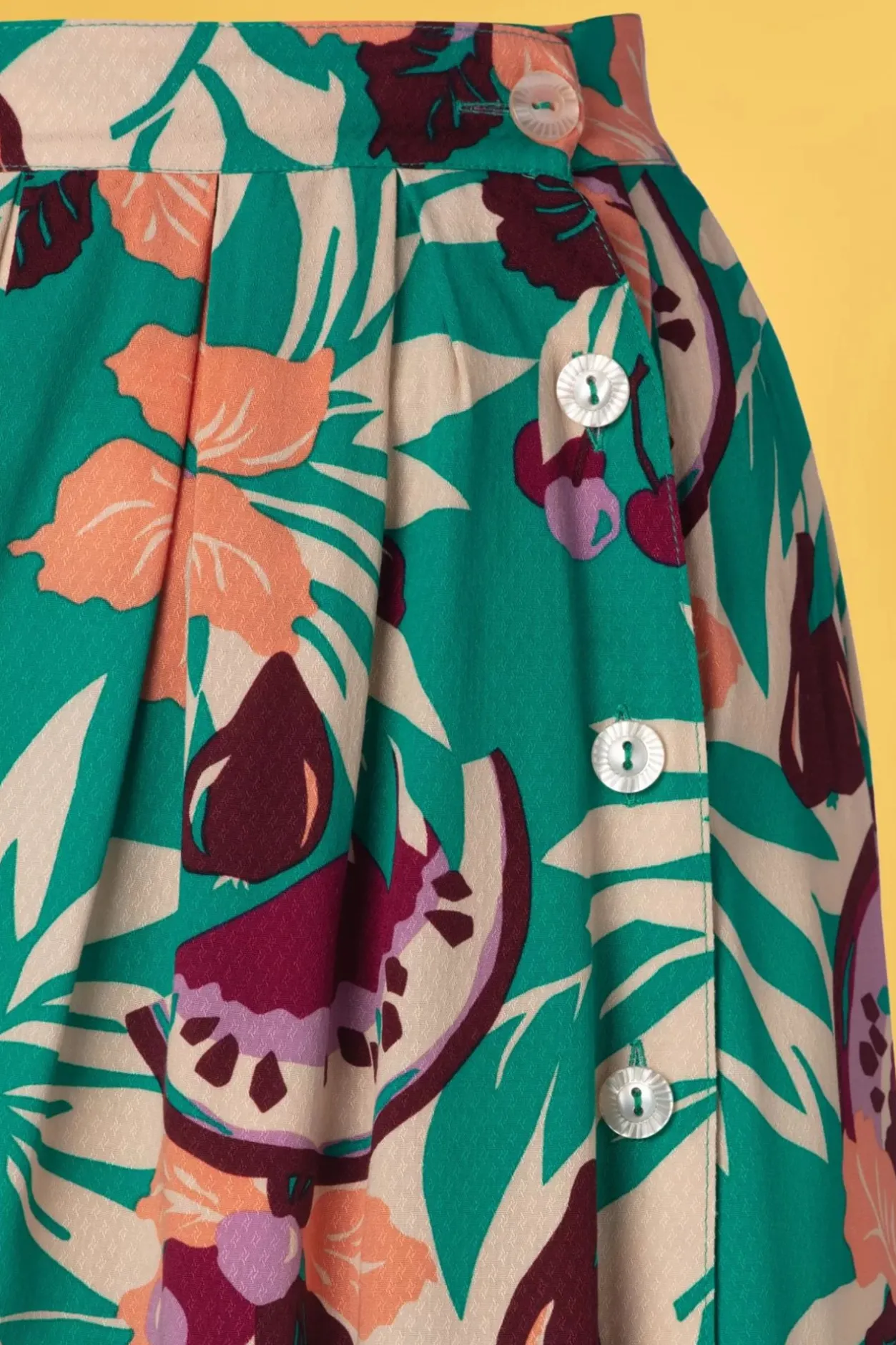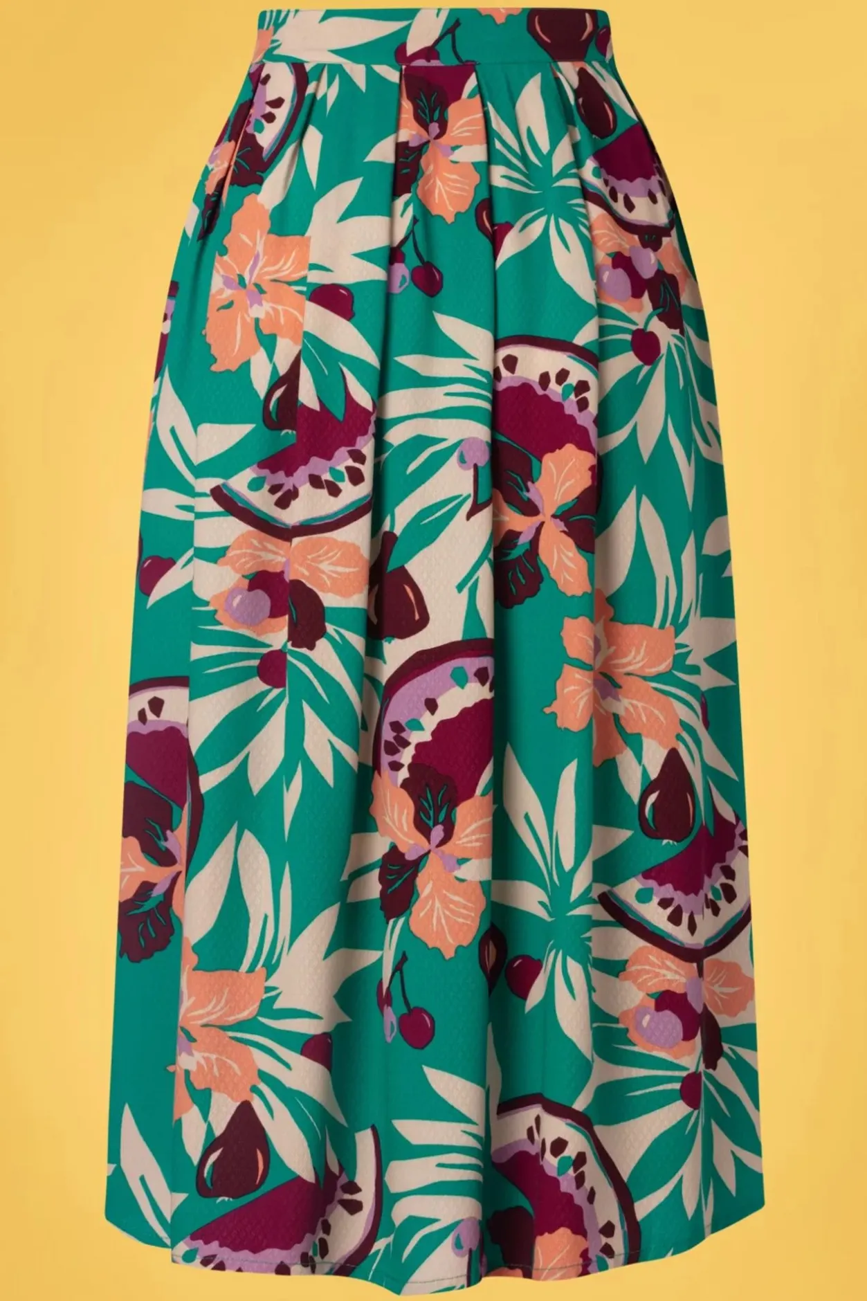 ”I’M Nicer When I Like My Outfit!” Dan Heb Je Een Fantastische Dag Wanneer Je Deze Arianna Pleat Skirt In Aqua Green Draagt. Arianna Wordt In De Taillegedragen En Loopt Uit In Een Flatterende, Semi-Swing Rok Met Platte Plooien En Een Speelse Knoopsluiting. Uitgevoerd In Een Soepel Vallende, Ecovero Viscose (Stretcht Niet) In Zeegroen Met Een Fantastische, Tropische Retroprint. Een Leuk Sandaaltje Eronder, Een Matching Top En Je Bent Helemaal Klaar Voor Warmere Dagen!