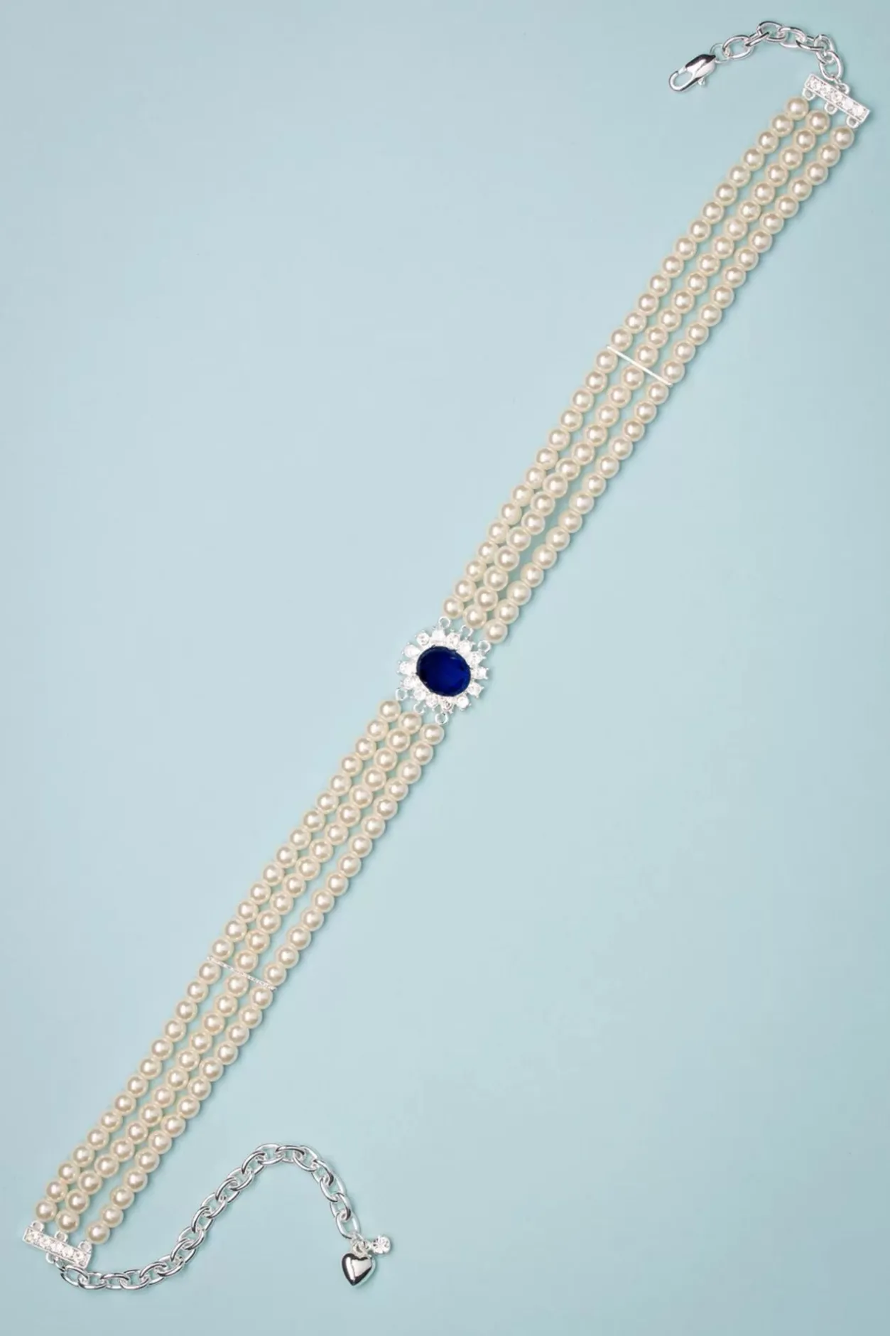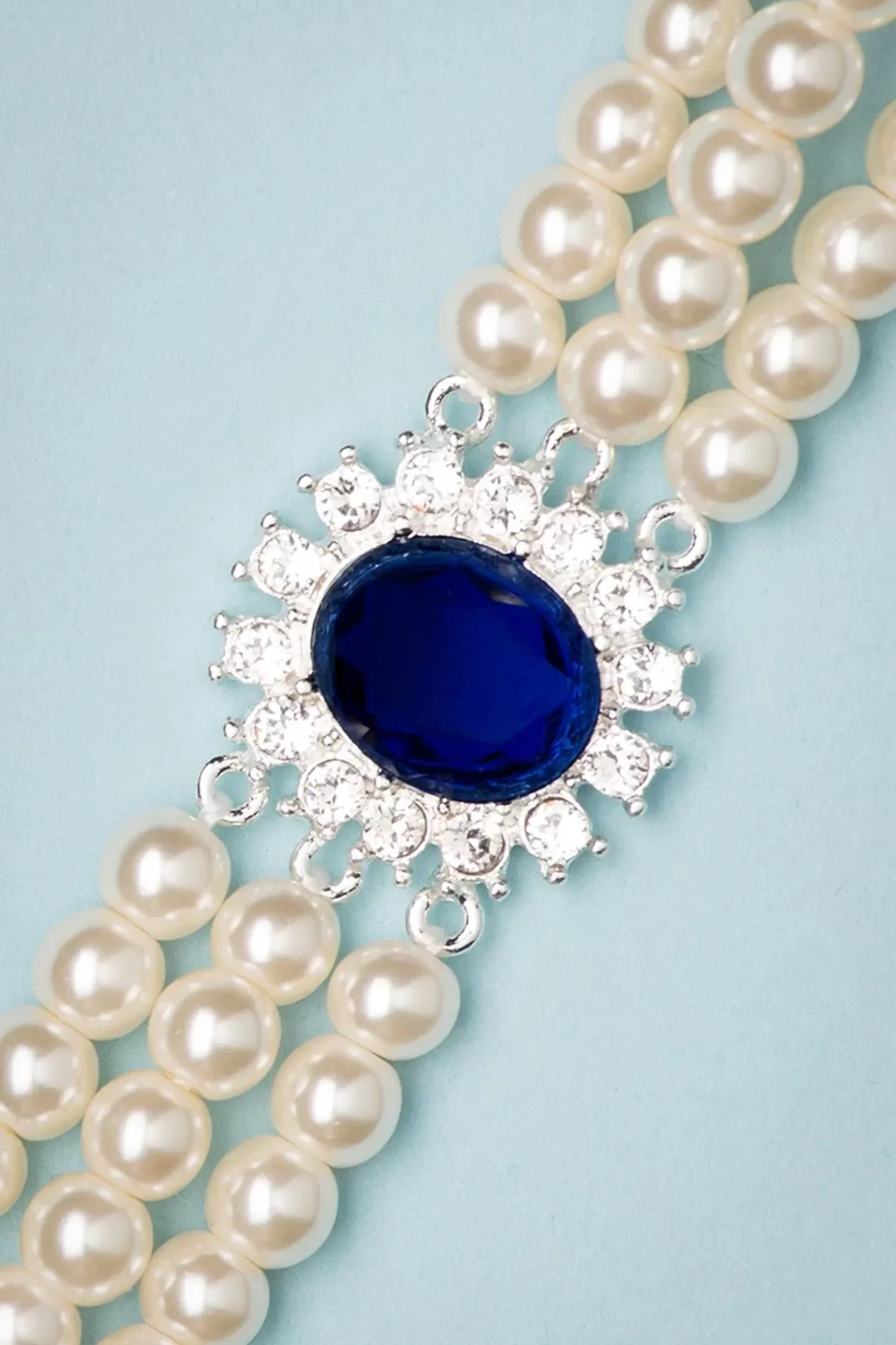 De Sieraden Van Prinses Diana Waren Even Gevarieerd Alsmooi. Ze Had Oog Voor Stijl En Gaf Klassieke Items Een Moderneuitstraling. Dit Was Dan Ook De Inspiratie Voor Deze Lady Diana Pearl Choker Necklace In Sapphire Blue. Een Zilverkleurige, Hypoallergene, Handgemaakte Ketting In Choker Stijl Met 3 Rijen Ivoorkleurige ‘Faux’ Parels En Een Saffierblauwe Steen Omhuld Door Sprankelende Strass Steentjes Voor Een Vleugje Glamour! ”Be Loyal To The Royal Within You!”