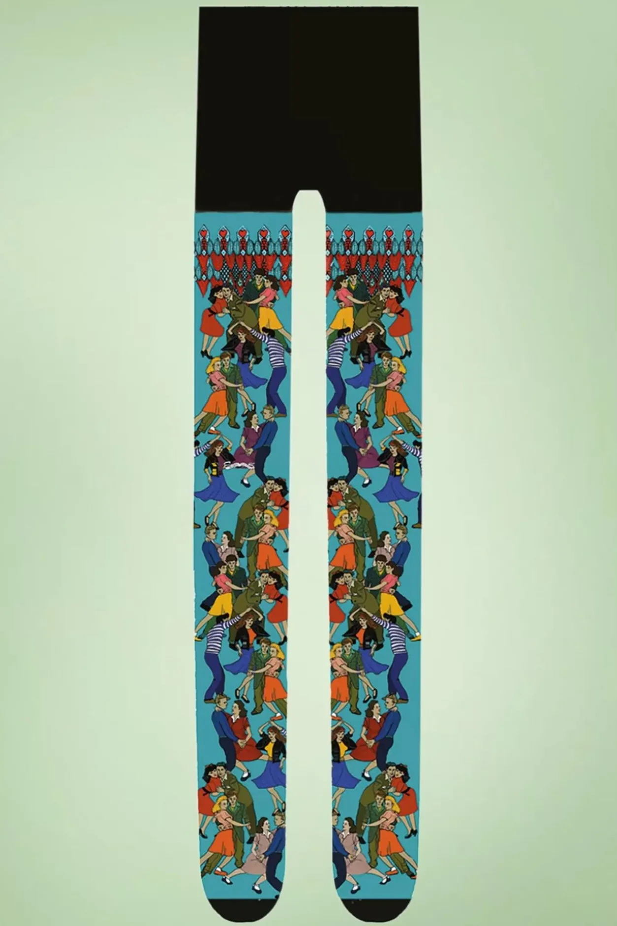 Ze Worden Met Liefde En Passie Ontworpen En Bedrukt In Een Atelier In De Buurt Van Lyon En Zijn Dan Ook Echte Kunstwerkjes Aan Je Benen! Deze 50S Danse Panty Uit De Rockabilly Collectie Van Ons Nieuwe Merk Marie Antoilette Hebben Een Turquoise-Blauwe Achtergrond Met Een Kleurrijke Print Van Rockabilly-Dansers, Die Je Uitnodigen Om Te Dansen En Plezier Te Hebben In Het Leven. Ze Zitten Heerlijk Comfortabel Om Je Benen En Stretchen Goed Mee. Laat Je Benen Spreken!