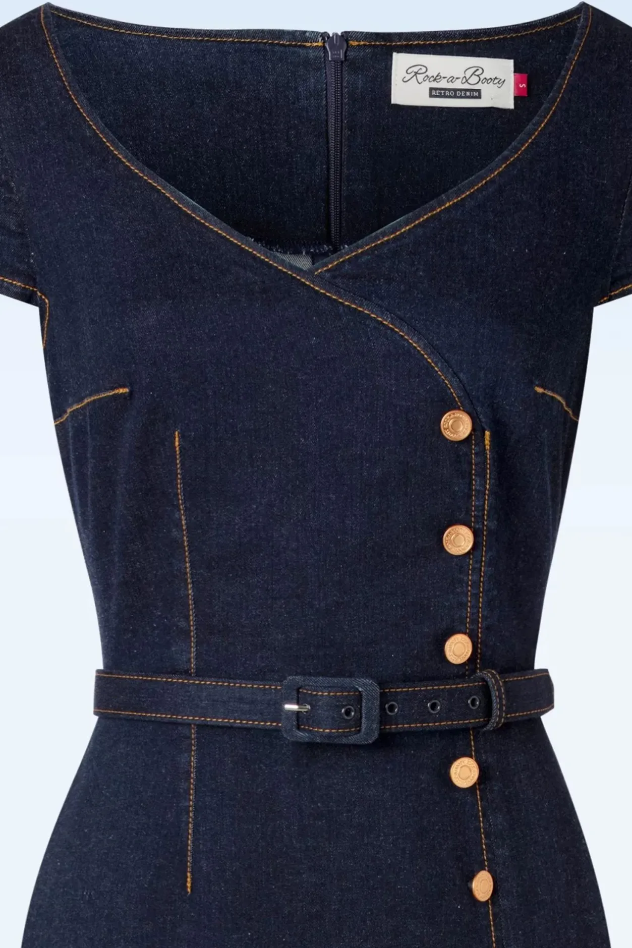 Ons Eigen Merk Rock-A-Booty Staat Bekend Om Haar ‘Unique Blue Dreams’… En Deze Eliose Pencil Dress In Blue Is Een Denim Droom Die Ons Hartje Op Hol Laat Slaan! Rock Your Booty… Uhhh… Body In Deze Curve-Hugging Denim Button Dress ;-). Eliose Heeft Een Elegante V-Halslijn, Korte Kapmouwtjes, Een Reeks Koperkleurige ‘Faux’ Knopen, Een Afneembare Tailleriem En Een Sexy Split Aan De Voorzijde. De Prachtige Stevige Maar Stretchy, Indigoblauwe Katoenmix Volgt Je Rondingen Perfect En Is Afgewerkt Met Bruin Stikwerk Voor Die Authentieke Touch. ”Baby Booty, Juicy Fruity, Truck Stop Cutie, Eliose Beauty, I’M In Love With You!”