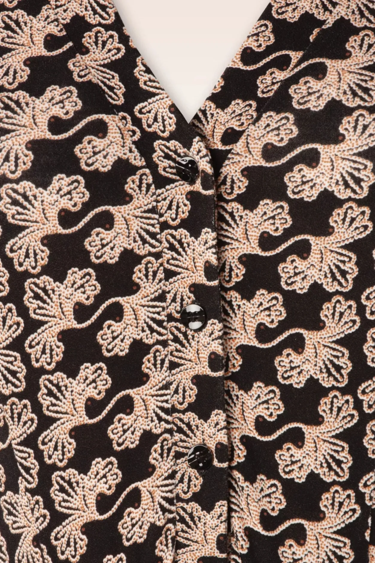 ”Choose Amelia!” Ze Is Uitgevoerd In Een Stretchy En Zachte, Zwarte Viscosemix Voorzien Van Een Grafische Bloemen Print In De Kleuren Gebroken Wit En Oranje.