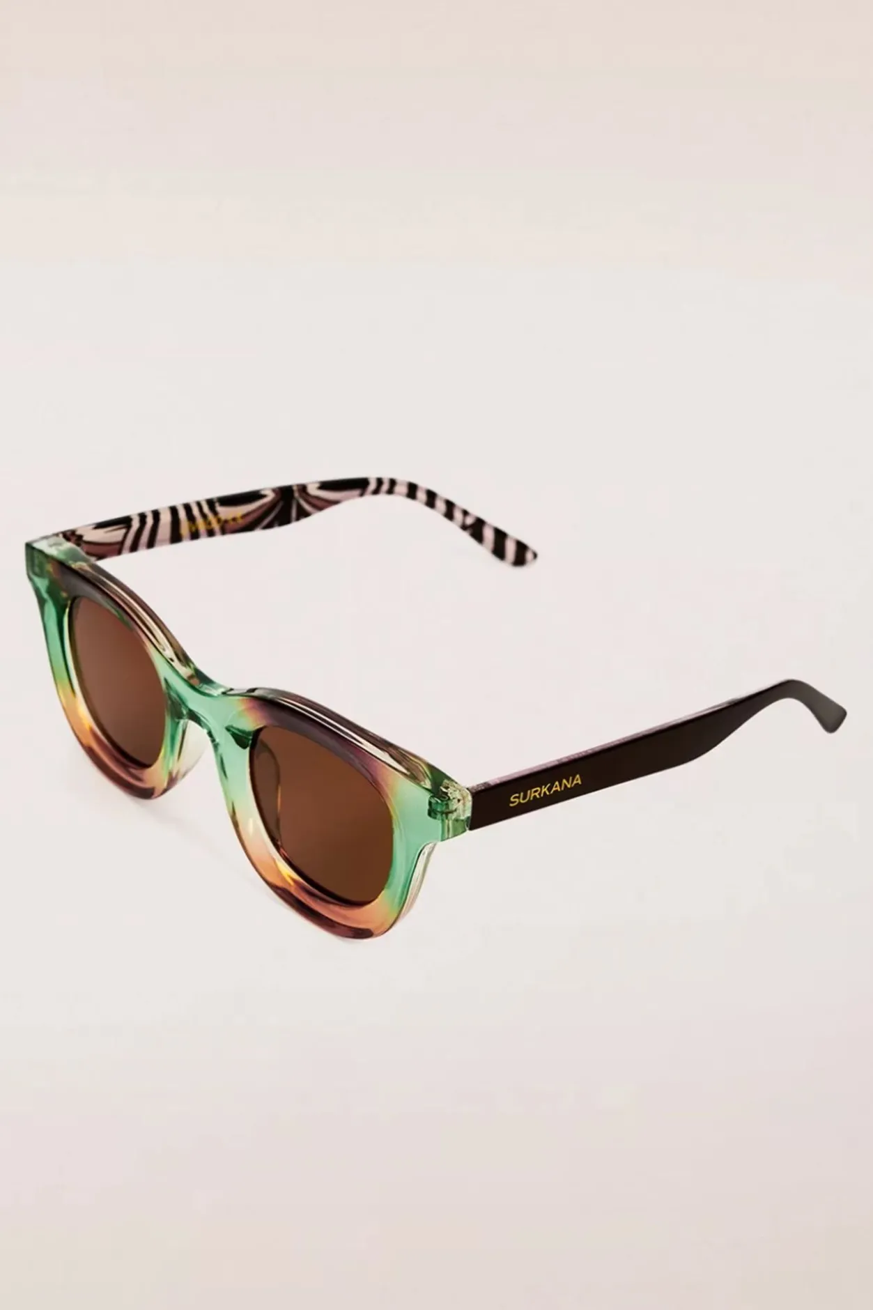”Let Your Sunglasses Do The Talking!” Een Stijlvol Model Gemaakt Van Gerecycled, Semi Transparant Kunststof In Groen En Bruin, Met Donkerbruine Pootjes Voorzien Van Een Streepjesprint En Bruine Poly Carbon Kunststof Glazen.