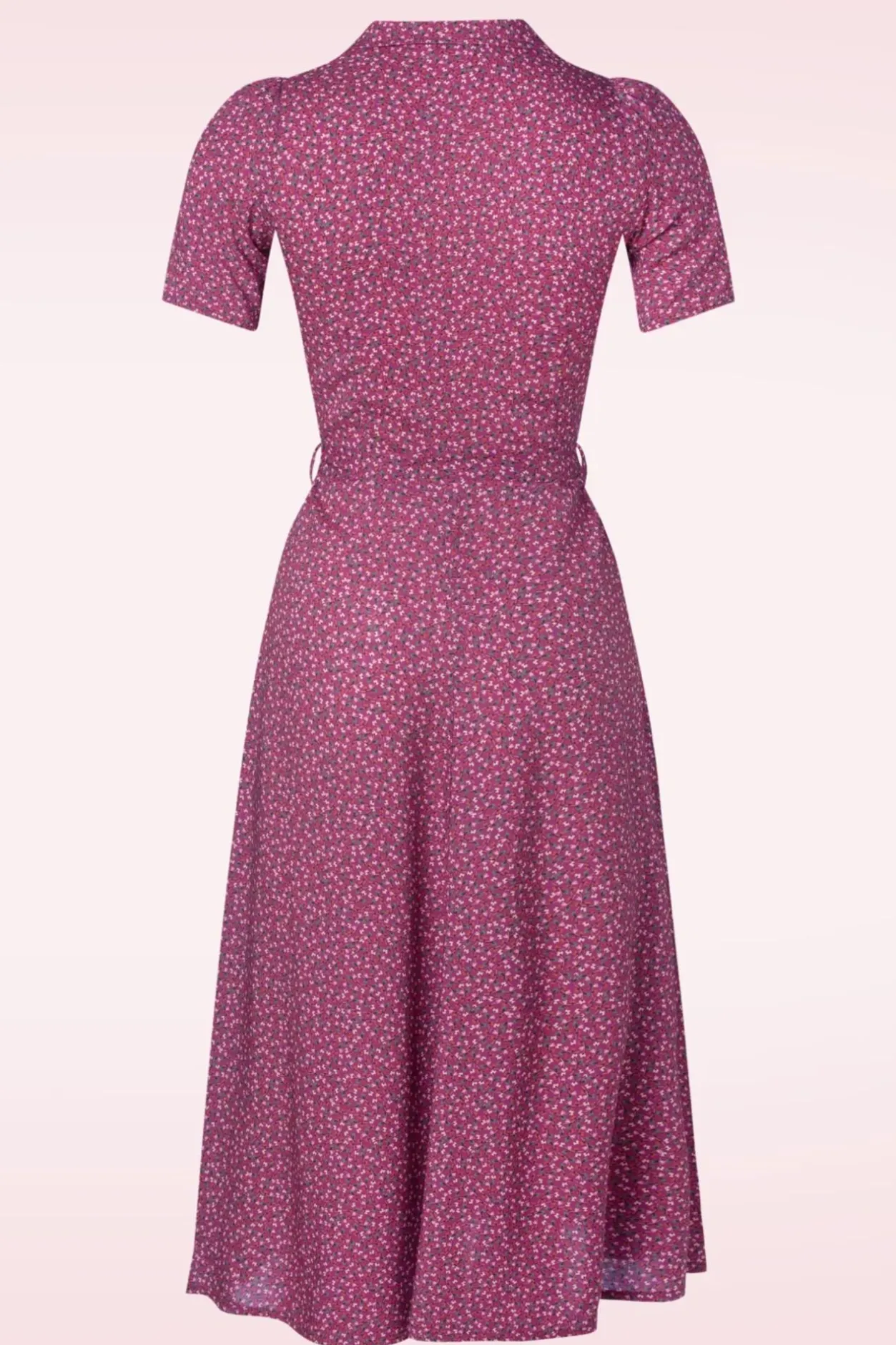 Voeg Wat ‘Fourties Flair’ Toe Aan Je Garderobe Met Deze Minouche Jurk! Ze Heeft Een V-Halslijn Met Een Speels Revers Kraagje, Korte Pofmouwen En Een Reeks Grote Knopen. Het Striklint Accentueert Je Taille Voor Een Super Vrouwelijk Silhouet. Uitgevoerd In Een Soepele, Non-Stretchy, Paarsrode Viscose (Ecovero) Voorzien Van Lieflijke Bloemen Die Heerlijk Draagt. ”I Feel Pretty, Oh, So Pretty!”