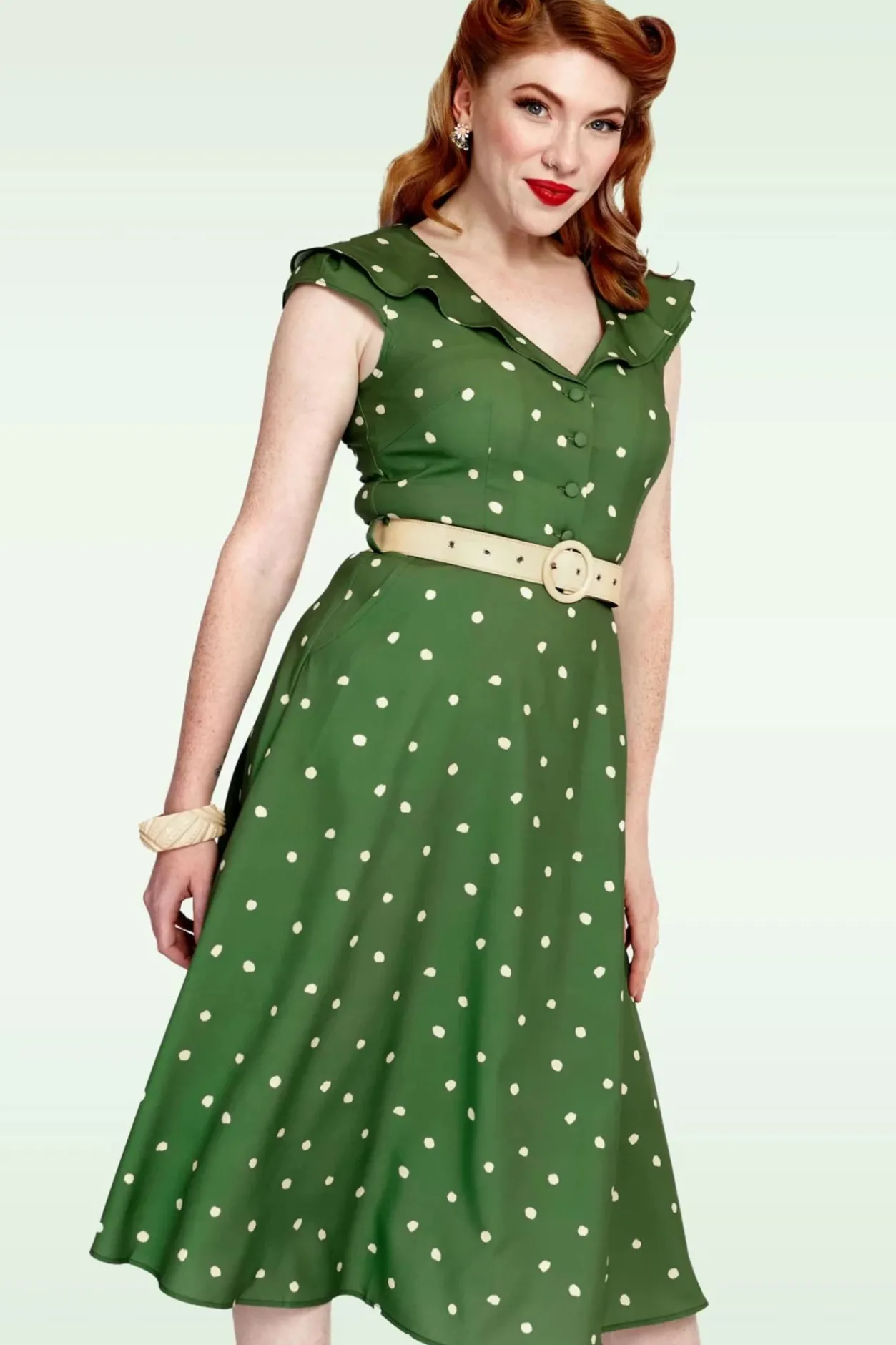 ”Cute, Cuter, Cutest!” Deze Dotty Wide Collar Midi Dress In Green Heeft Alles Wat Je Zoekt In Een Jurk! De Top Is Voorzien Van Korte Kapmouwtjes, Een Brede, Afgeronde Kraag Die Doorloopt Aan De Achterkant En Een Speelse Knoopsluiting. Vanaf De Taille Met Afneembare Riem Loopt Ze Uit In Een Flowy And Flirty Midi Rok Met Handige Steekzakken. Uitgevoerd In Een Soepele, Luchtige Diepgroene Stof (Stretcht Niet!) Met Crèmekleurige Polkadots All-Over Voor Een Comfy Fit. Deze Cutie Is Er Bovendien In Meerdere Kleuren… Welke Is Jouw Favoriet?